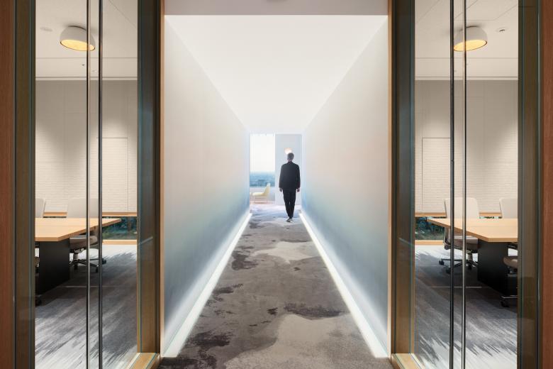 このプロジェクトでは、社員が業務内容や気分に応じて最適な場所を自由に選択できるABW(Activity-Based Working)の働き方をベースに、柔軟で自律的に働くことのできる環境づくりをしています。広大なフロアに同じデザインの空間は一つとして存在せず、ここで働く社員は、日々新鮮な気持ちで環境を選び、仕事に取り組むことができます。また、誰もが気軽に使えるコミュニケーションエリアを数多く設け、オフィス内のいたるところで自然と会話が生まれる状況を生み出しました。