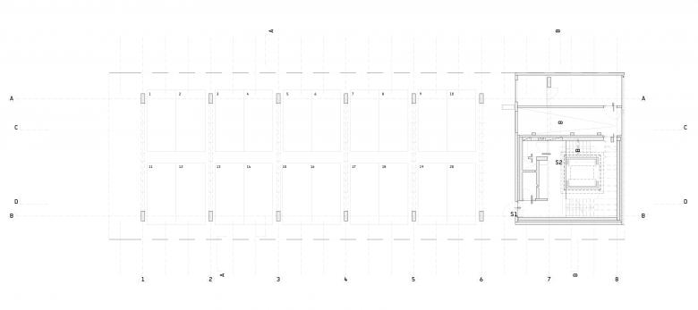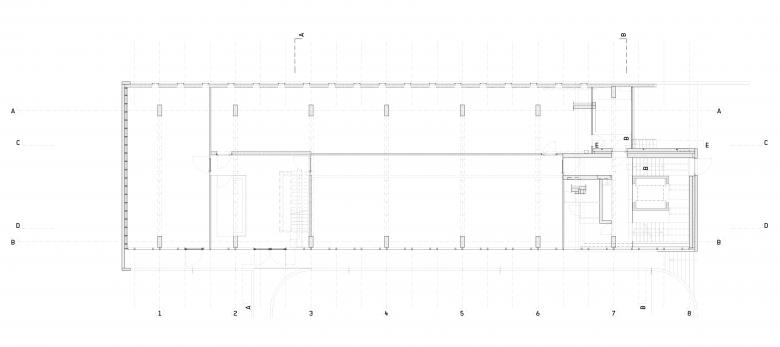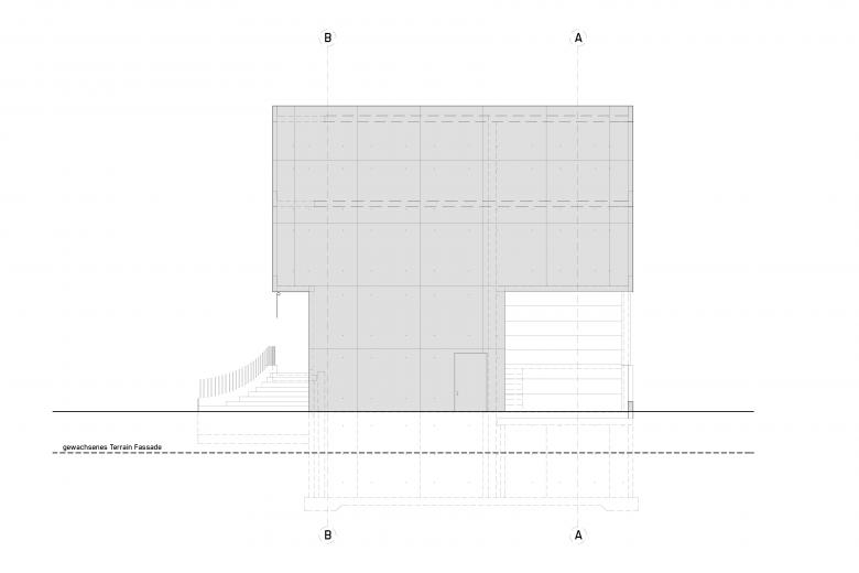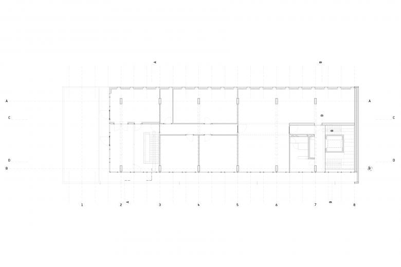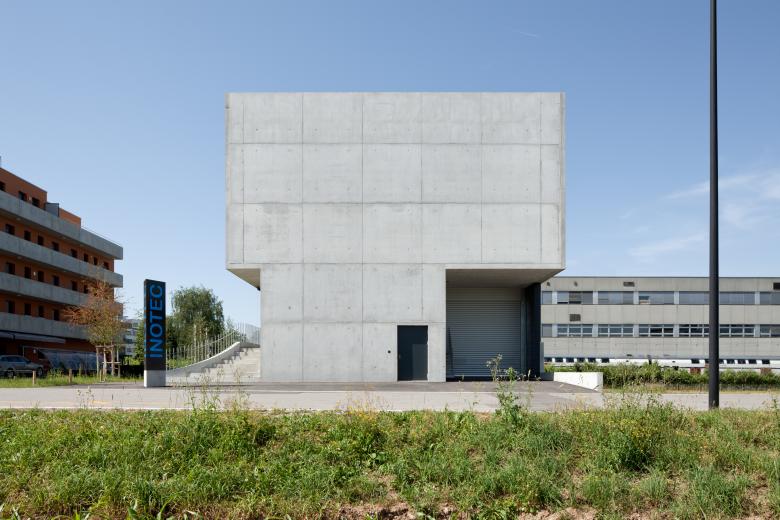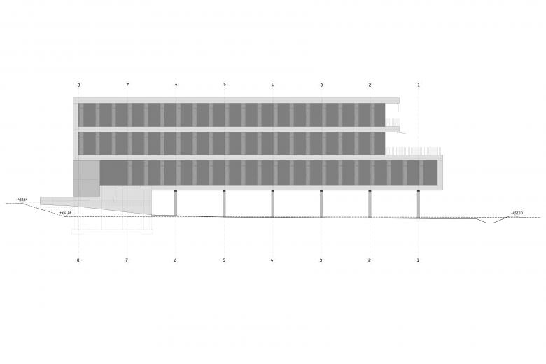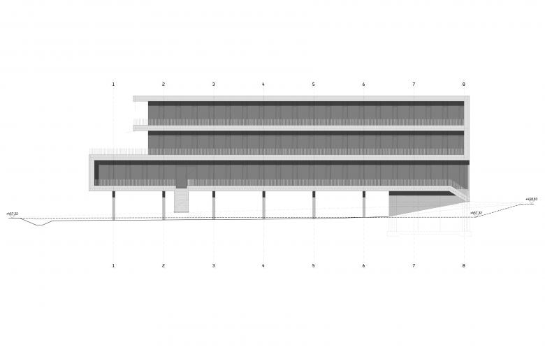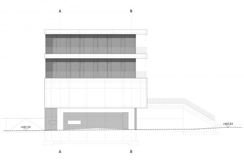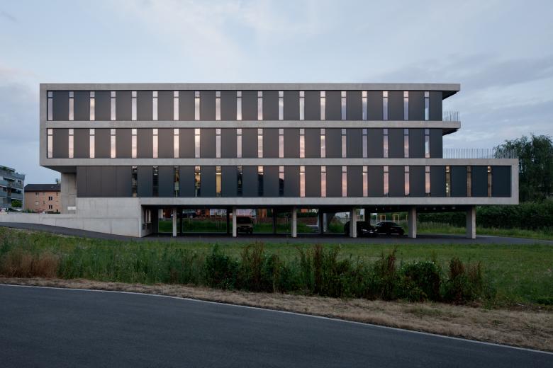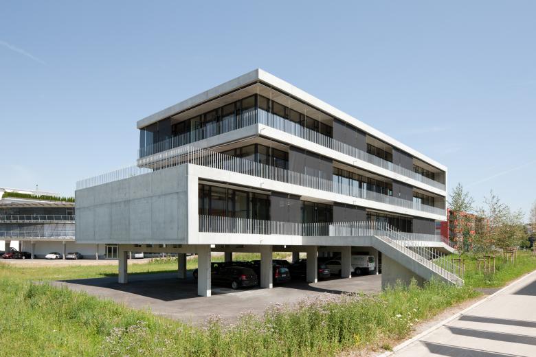 Das quer zur Bahnlinie stehende Gewerbehaus vermittelt zwischen der Industriepark-Strasse und dem Bahndamm. Horizontal erschliesst sich das Gebäude direkt über den Fussweg oder über einen Laubengang. Unterhalb des aufgeständerten Skelettbaus ist die Tiefgarage ins Terrain geschoben. Die Deckenstirnen sind prägende Fassadenelemente und binden die einzelnen Vor- und Rücksprünge wie selbstverständlich ein.