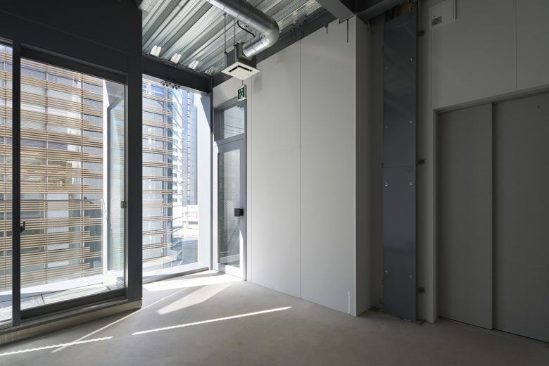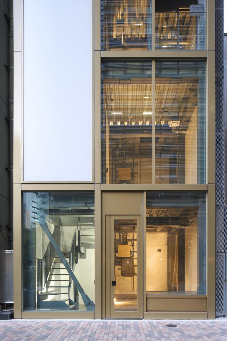 西側のスペースは設備配管を通すためのパイプスペースにしているが、吸気口を設けられるように外部化している。テナント工事があとからできるように、この外部パイプスペースに面する壁には大きなけんどん式の点検パネルを設け、外側はエキスパンドメタルで覆った。