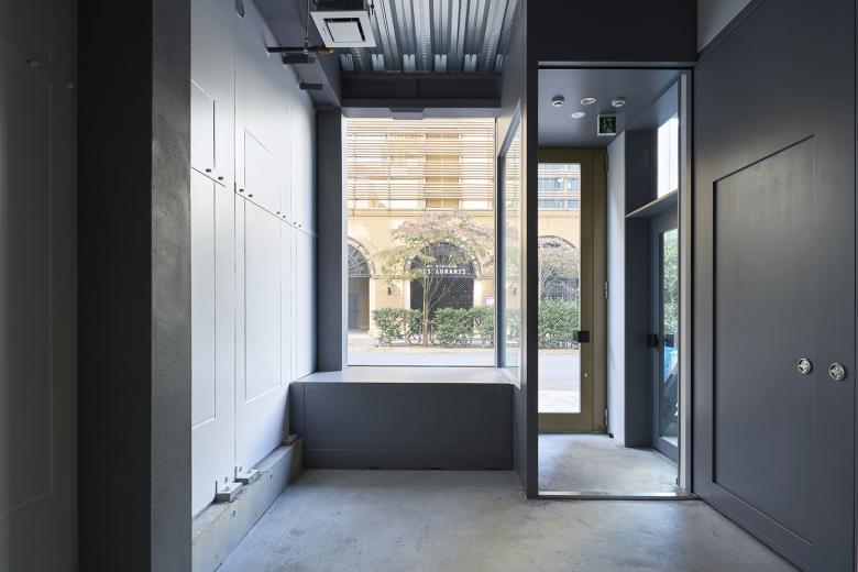 1階部分は敷地の西側に50cm弱のスペースを設け、水道の量水器を設置しているが、汚水桝を設置する外部空間の確保が困難だったため、正面の窓サッシの腰部分のみをセットバックして外部化して汚水桝を設置した。避難階段はファサード側に設置し、避難階段から出口までの避難経路をコンパクトにした。