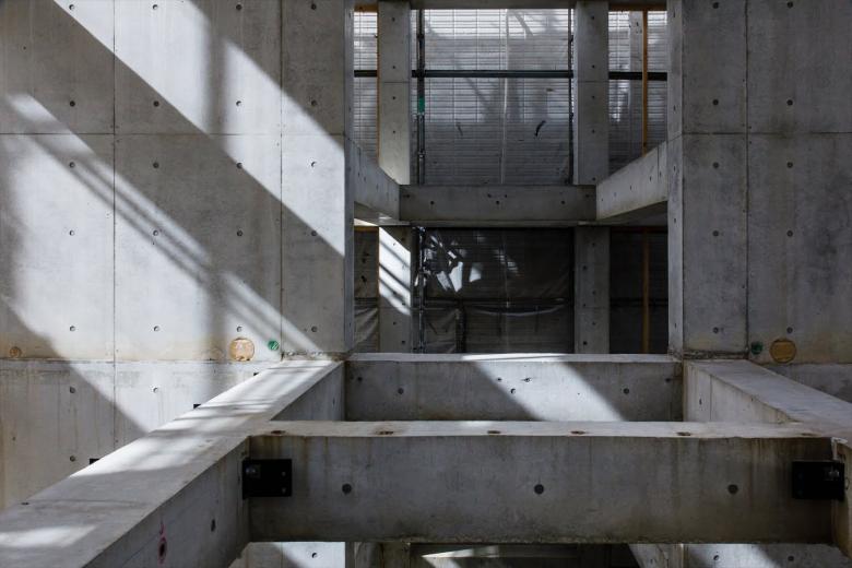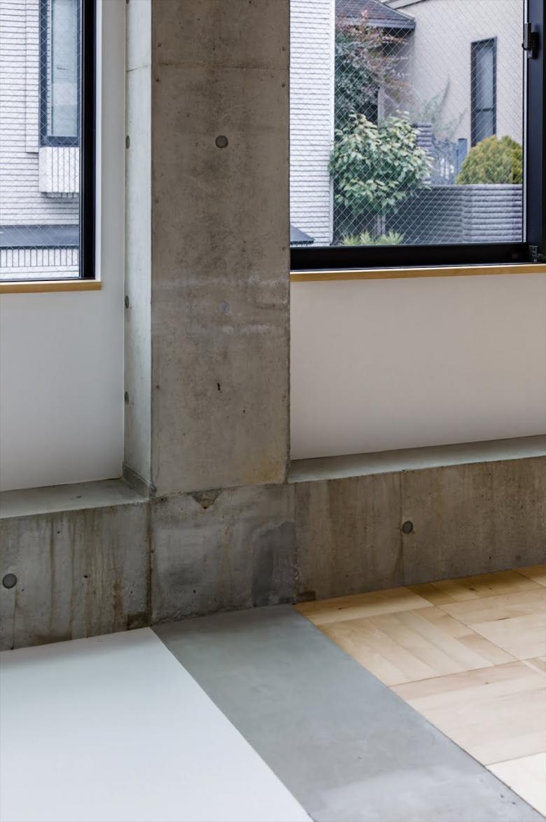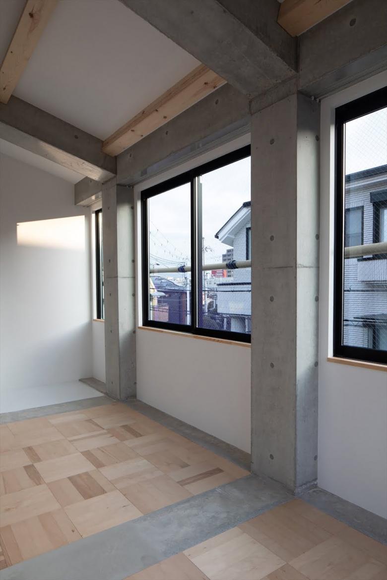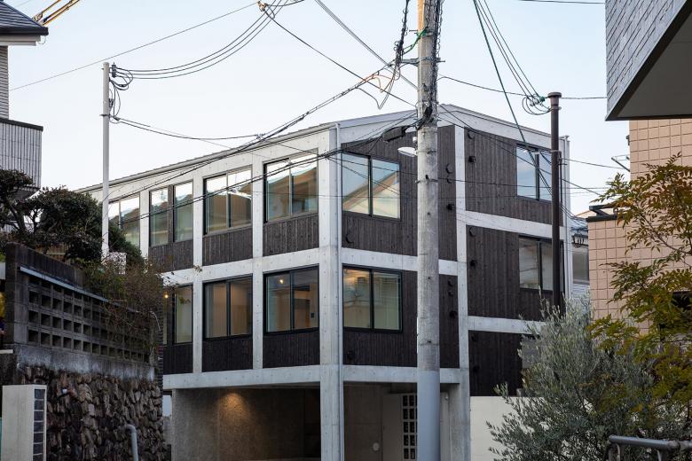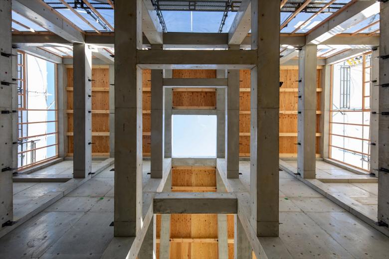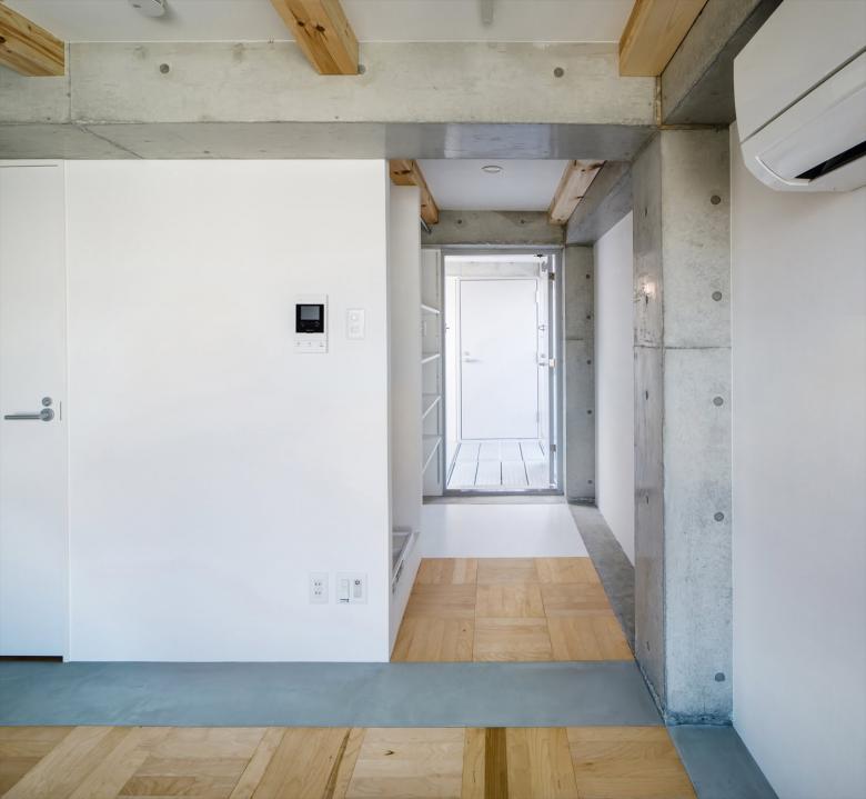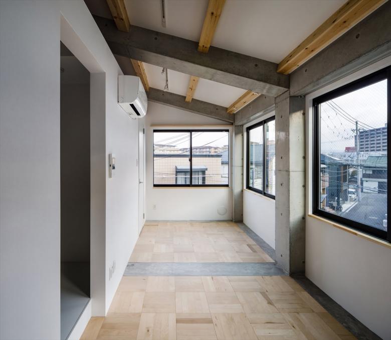 構造は350角のRCラーメン構造の柱梁に木の壁・床・屋根を嵌め込んだ1時間準耐火構造(木三共)の混構造建物とした。外壁は耐風圧をコンクリートの柱梁に依ることで下地を45mm角の杉材下地で構成し、内部天井は燃え代設計のために決められたやや大ぶりな木小梁と準耐火構造のために2重に貼られた12.5mmの石膏ボードをあらわした。固いRCと柔らかな木架構の組み合わせによって、40㎡の1LDKにしたり、床を解体して80㎡のメゾネット住戸にしたりと、平面だけでなく立体的にも将来の変化に柔軟に対応するための余白を潜在的に内包し、静かに未来の状態変化を待っているような「状況の中の建築」を目指した。