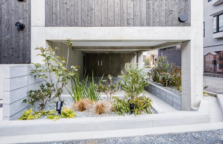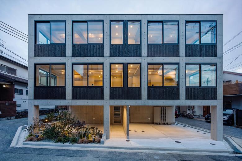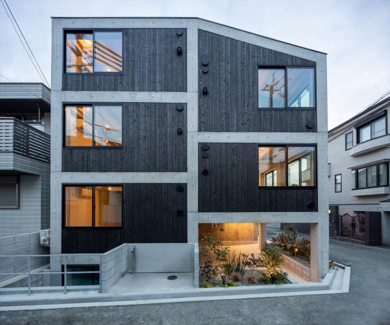 敷地は箕面有馬電気軌道(阪急電鉄)の創業者小林一三が沿線開発の一つとして手掛けた豊中住宅地の一角に建つ。外壁や塀に木材を用いたり宅地内に植物を多く取り入れたりしている住民の息を感じることのできるヒューマンスケールを持つ街並みとできるだけ馴染むような佇まいとなることを期待した。スタティックになりがちなRCラーメン構造は、駐車場確保のためのピロティ柱の間引きや、共用部の効率化のために東西でずらしたスキップフロア、木三共成立のために直接外気に開放させた階段室などの計画的法規的対応をポジティブに取り込むことで軽さやスケールを、外壁は焼杉を採用したり植栽は地域在来植物と特色のある園芸種をミックスしたりすることで、風景の連続性を持たせたいと考えた。