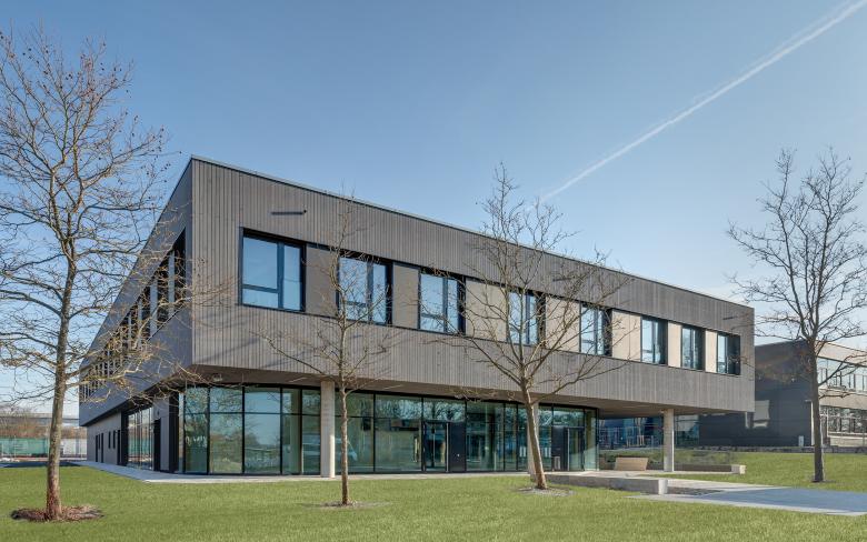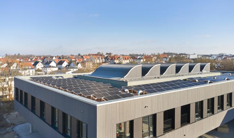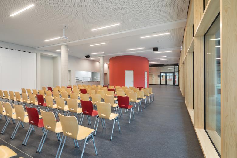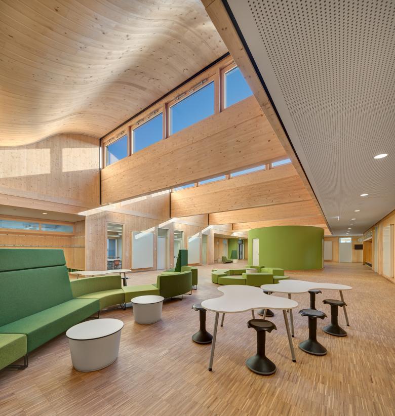 Während das Erdgeschoss wie auch die Teilunterkellerung in Massivbauweise aus Stahlbeton ausgeführt werden, wird der Klassentrakt im Obergeschoss in Holzbauweise errichtet. Der Einsatz von Holz verleiht dem Marktplatz eine warme, behagliche Atmosphäre, die überspannende Sheddachkonstruktion mit Oberlichtern schafft eine natürliche Helligkeit. Die ebenso offene und lichtdurchflutete Gestaltung der Mensa und der Klassenräume verleiht dem gesamten Erweiterungsbau eine hohe Aufenthaltsqualität.