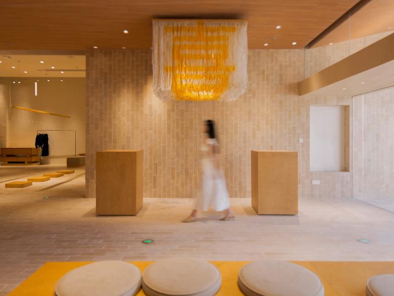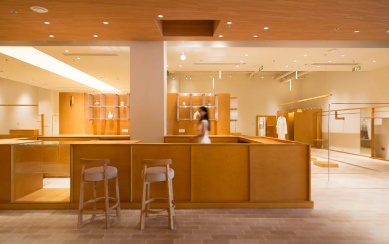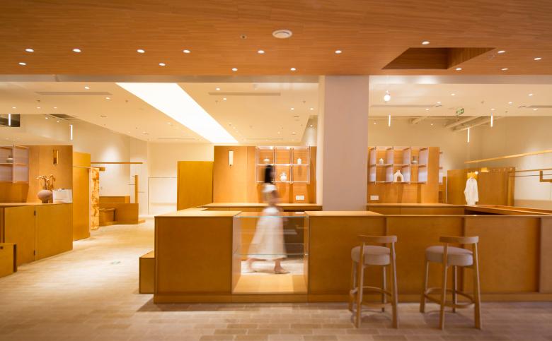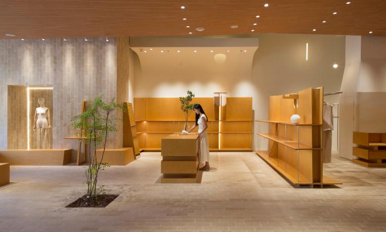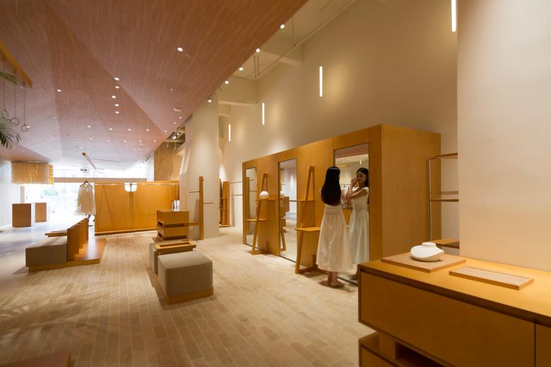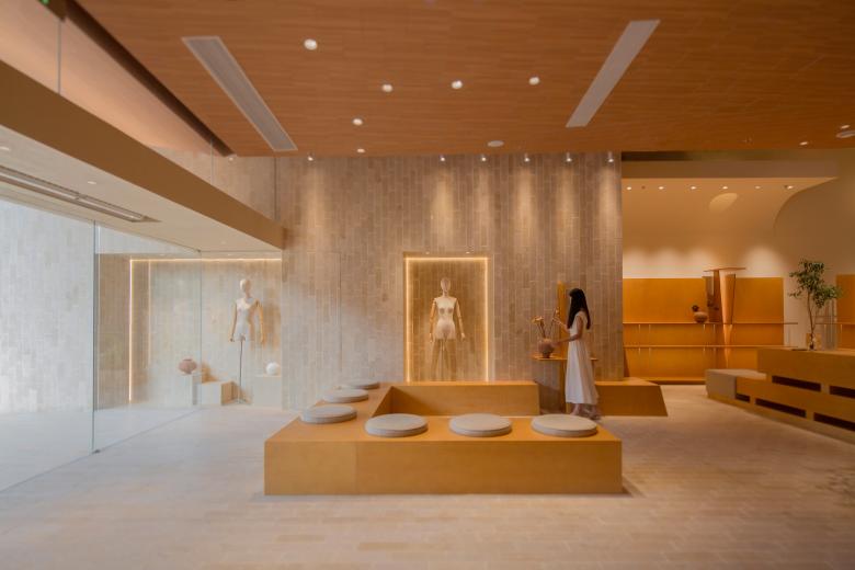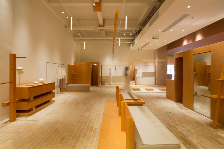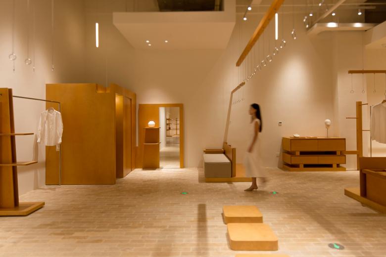 如果说起伏的屋面是引导了空间前进的主动线,那家具布置则是串联起了空间的起承转合。场地内并没有依靠墙体来划分不同的陈列区,而是借用家具造型的特点,并利用轴线对称的布置方式,自然地过渡了陈列区的边界,也强化了所在领域的场所感。室内家具选用温润的暖色调,凸显桦木纹淡雅的特点,局部配以剑麻饰面,丰富材质的层次,在明快的造型轮廓处理下,不同功能类型的家具与同色系的墙、顶、地彼此映衬。出于对功能收纳的需要,在三联试衣间的两侧,两颗立柱下方向外隆起,轻轻挂起的柱线形吊灯将人的视线引至上方,在墙面的高处晕染出淡淡的色泽,此时,似乎来到某个老房子内,正围炉闲谈。