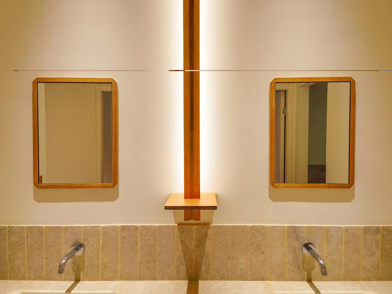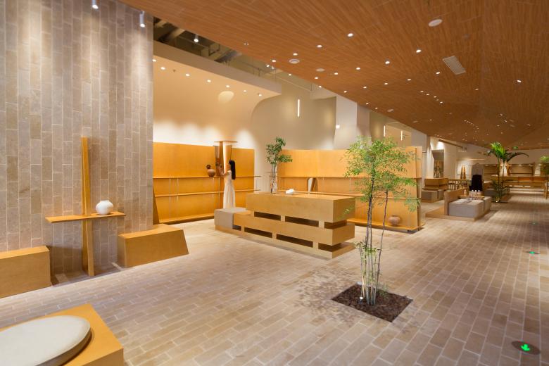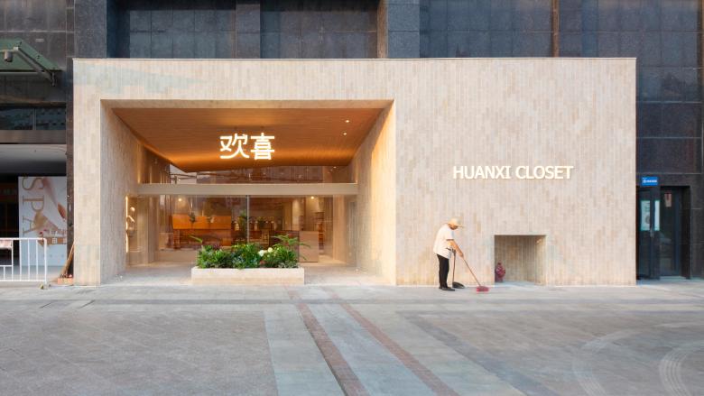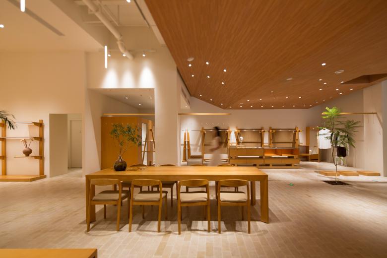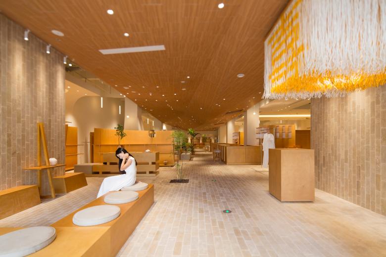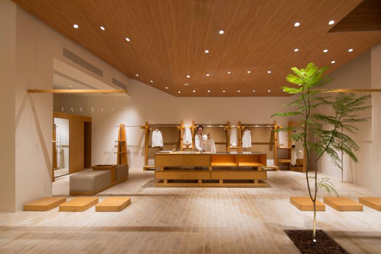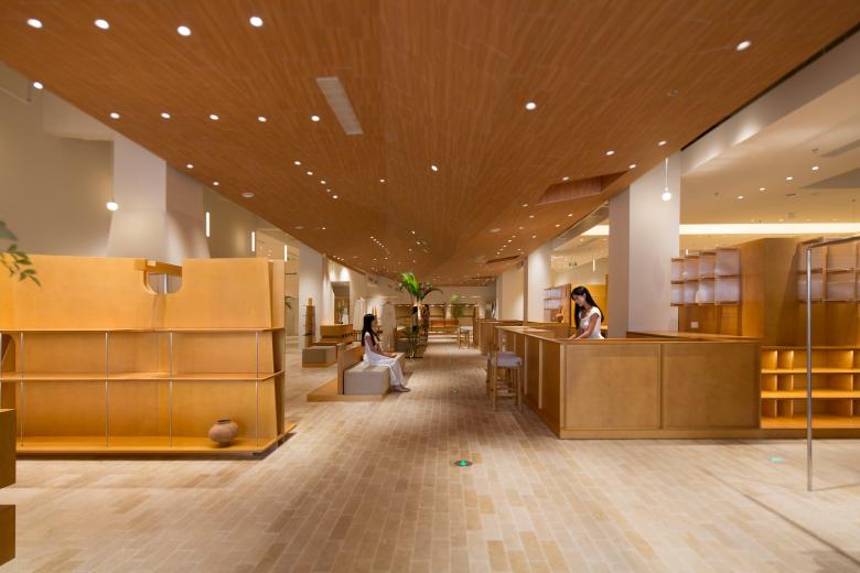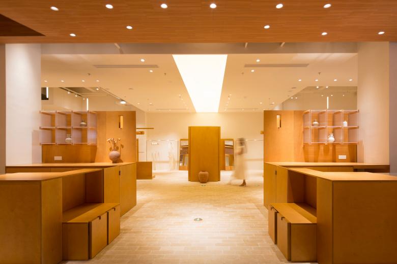 如果说起伏的屋面是引导了空间前进的主动线,那家具布置则是串联起了空间的起承转合。场地内并没有依靠墙体来划分不同的陈列区,而是借用家具造型的特点,并利用轴线对称的布置方式,自然地过渡了陈列区的边界,也强化了所在领域的场所感。室内家具选用温润的暖色调,凸显桦木纹淡雅的特点,局部配以剑麻饰面,丰富材质的层次,在明快的造型轮廓处理下,不同功能类型的家具与同色系的墙、顶、地彼此映衬。出于对功能收纳的需要,在三联试衣间的两侧,两颗立柱下方向外隆起,轻轻挂起的柱线形吊灯将人的视线引至上方,在墙面的高处晕染出淡淡的色泽,此时,似乎来到某个老房子内,正围炉闲谈。