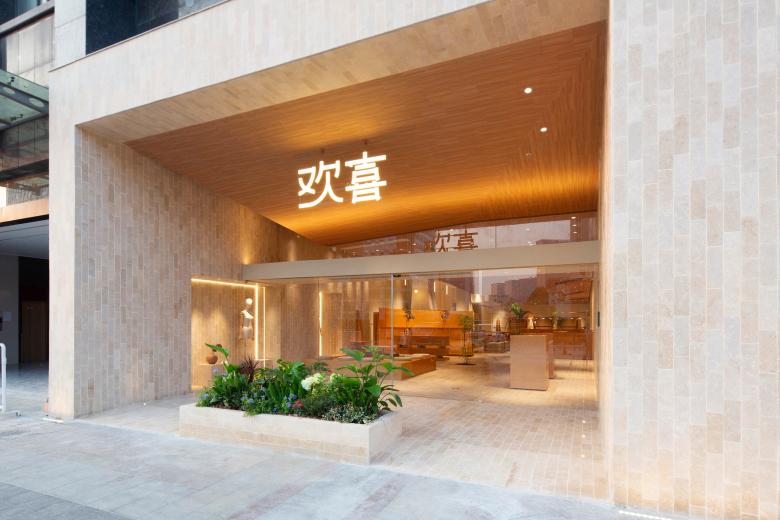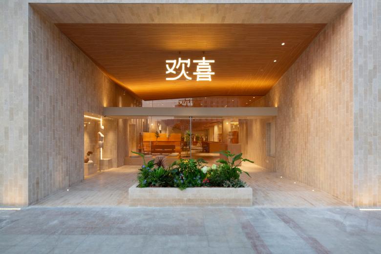 特意被切成小块的仿木纹冰火板在不同斜坡面以不同角度错缝贴,地面则以小块条形莱姆石顺应行进方向三七铺,在空间的节点处,下挖地面植入挑高的树种,自然景观的内置化与手工感材料施作的结合抵消了商业空间属性的直白,平添了几分闲暇的松弛。