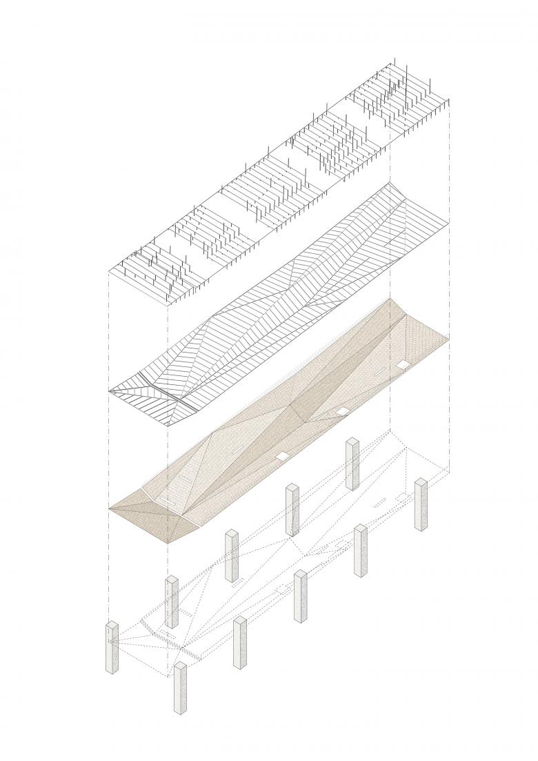 犹如褶皱般的屋面不仅是为了躲过内部复杂的管道系统,也是为了回应空间要素的变化——先以拔高的势态迎接着前厅客人的到来,紧连着主通道的一侧,屋面渐渐平缓降低,在它下方是沿纵深方向线形布置的两处收银区,它们贯穿于空间的正中位置从而辐射周边的陈列区块,在纵横流线的交汇处,屋面从一侧的最低点向另一侧再次跃起,这里是空间的枢纽,店员和熟客间的寒暄、与游伴在这稍作歇脚、又或是正踌躇要转向哪个陈列区。而与两侧的混凝土立柱脱开一道缝隙后,屋面最后以轻盈的姿态轻拂过整个流线通道,结束于末端陈列区的上方。