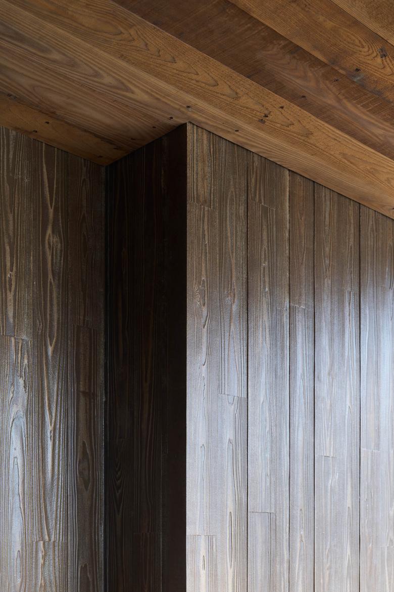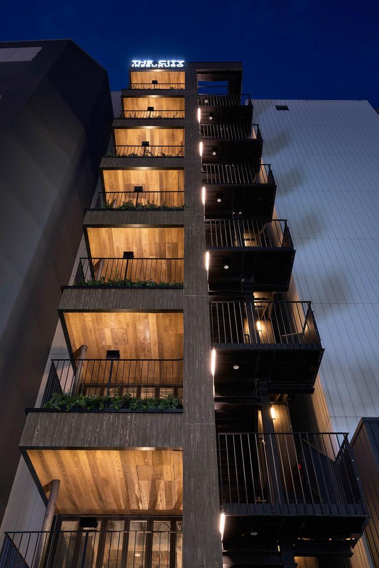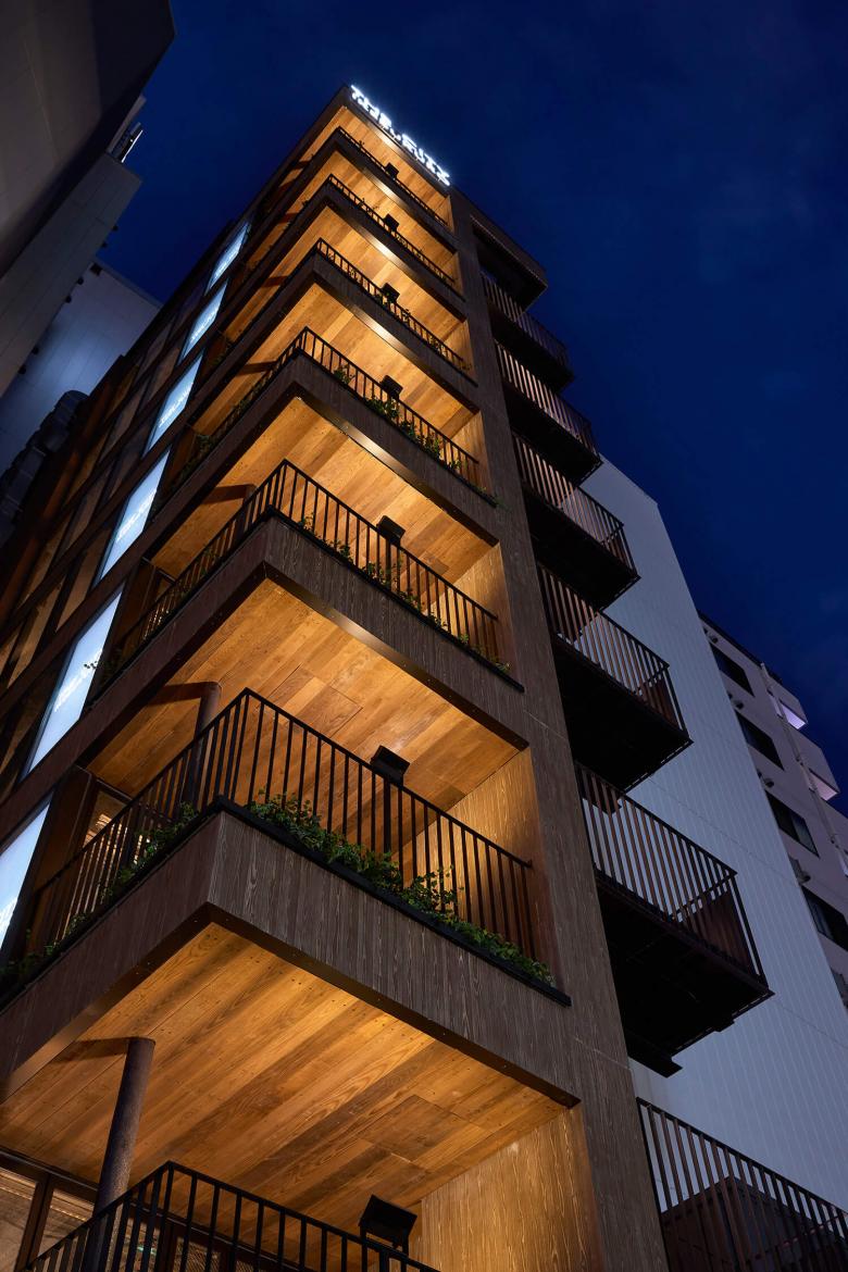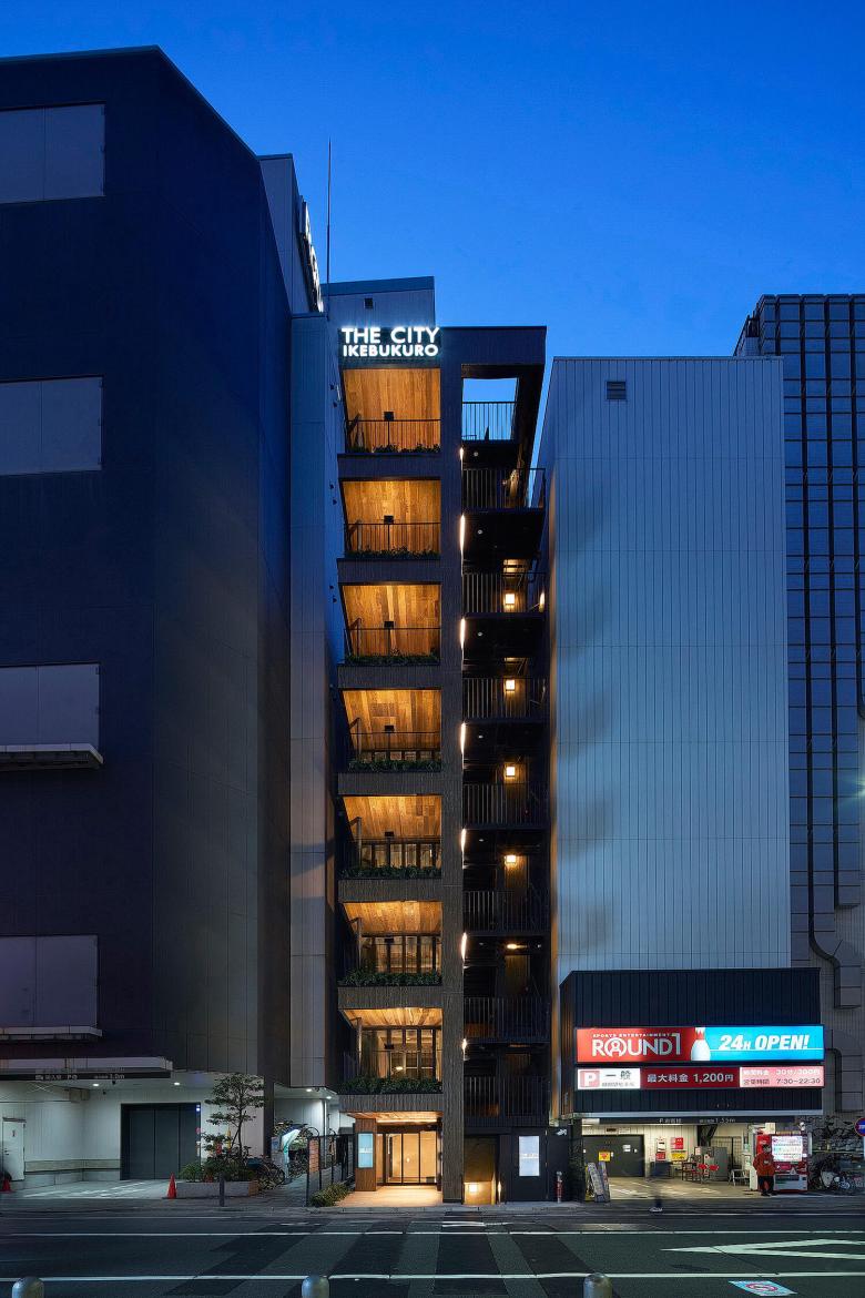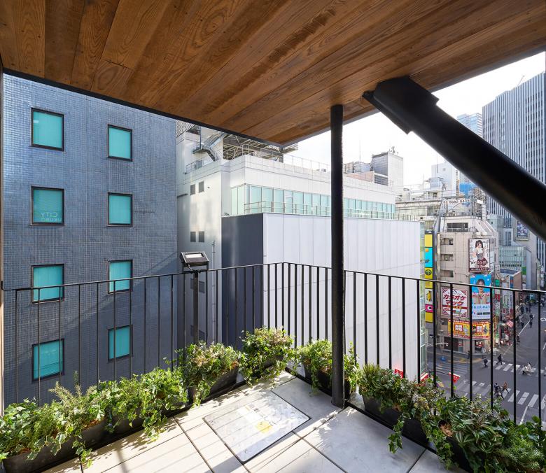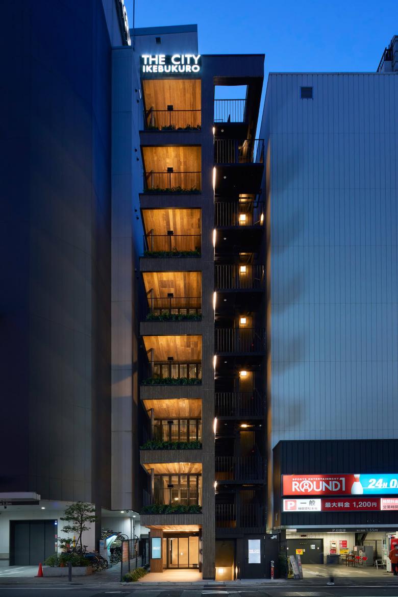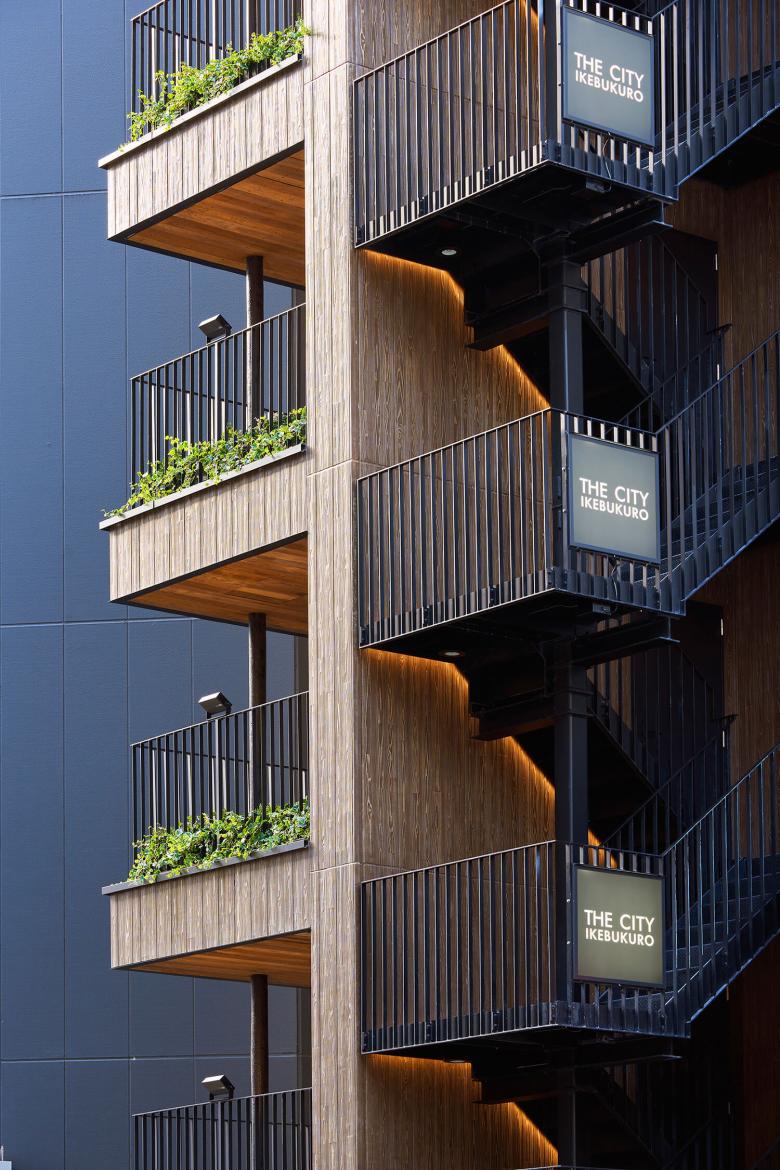 我々の設計してきた飲食テナントビルでは、恵比寿のテラスビル、神田テラスなどコロナ禍以前から積極的に提案してきたが、コロナ禍以降はテラスなどの屋外空間を設けることを望むテナントがより多く増えてきた。このビルでも、サンシャイン60通り側の側面ファサードには2.5m角のテラスを設けている。屋外避難階段の周囲2mは開口制限があるため、階段横のファサード面を前面まで押し出すと、ファサード面のほぼ全てが壁になってしまうが、テラスを設けてセットバックすることで、開口制限をかわして大きな開口を設けた。内外を連続させてテラスを使用できるように、全面開放できる折り戸のサッシを設置した。サンシャイン60通りからアプローチすると、この積層するテラスは大きな袖看板のように見えて、賑わいを通りにアピールすることができる。さらに建物に近づくと、ファサードは立面図としての見え方ではなくなり、見上げて見える軒裏がファサードとなる。このテラスの軒裏は燻製したアッシュで仕上げて、さらに手すりの上に設置された照明でライトアップすることで、このビルで一番目につく軒裏の天井面をもう一つのファサードとして立体的に表現している。外壁面のアスロックも木目のあるものを採用し、塗装も木調にして、モノトーンなラウンドワンの建物に対して有機的な佇まいを対照的に見せるようにしている。