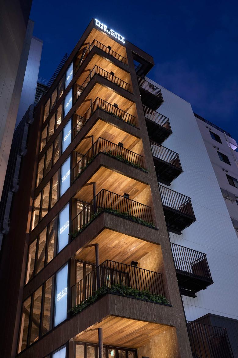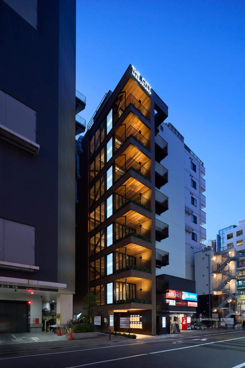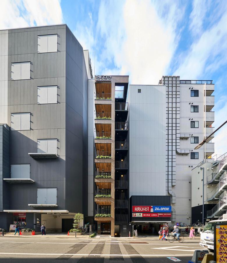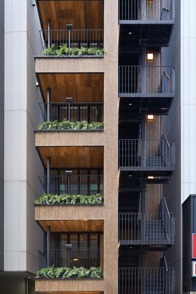 間口6.8m、奥行き16mという間口の狭い敷地なので、通常であればアピールできるファサードが前面のみに限定されるが、左右のラウンドワンの建物は10階建てにするため3mほどセットバックしており、前面以外に側面の一部もファサードとして見せることができる。