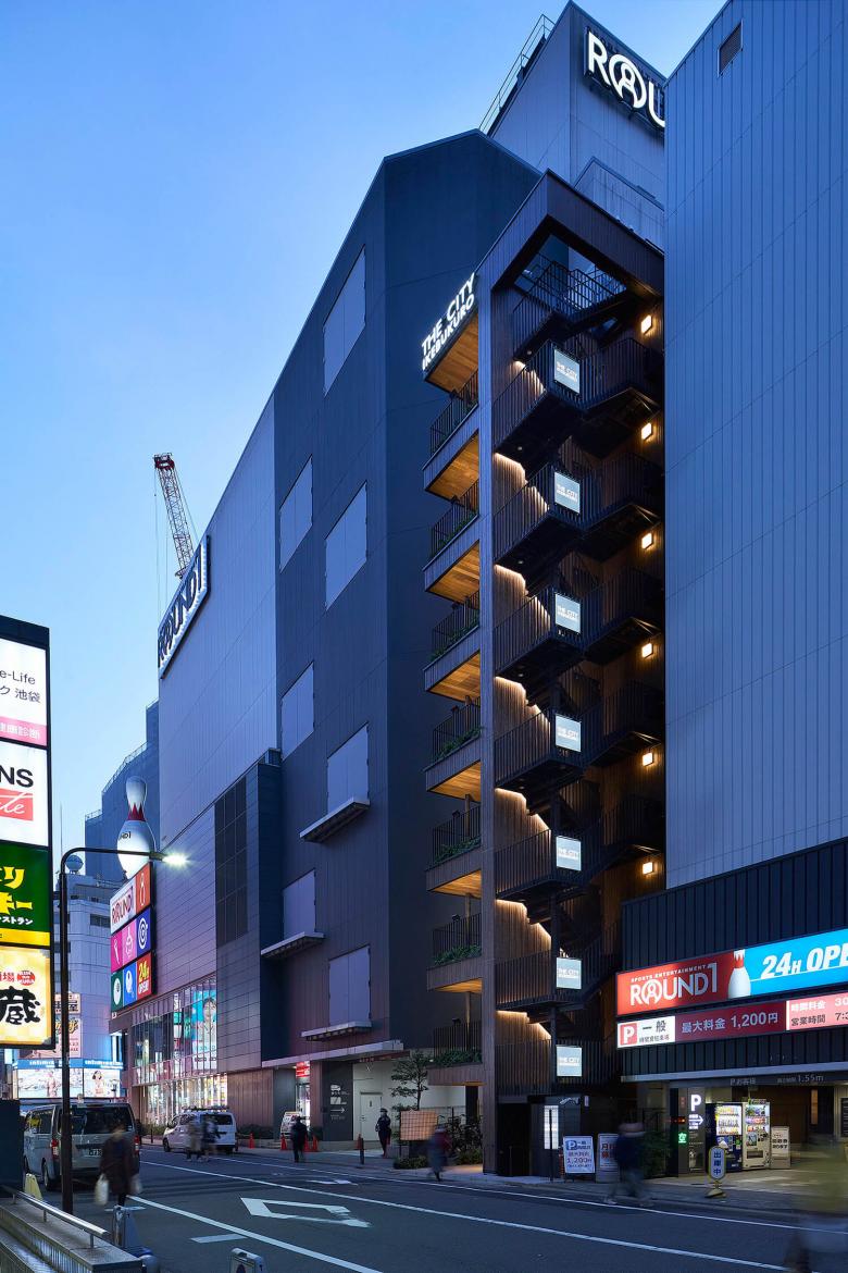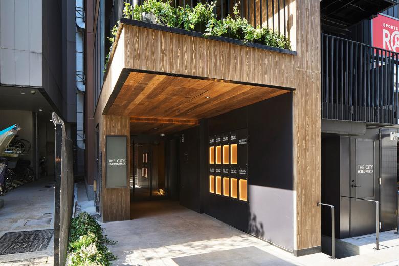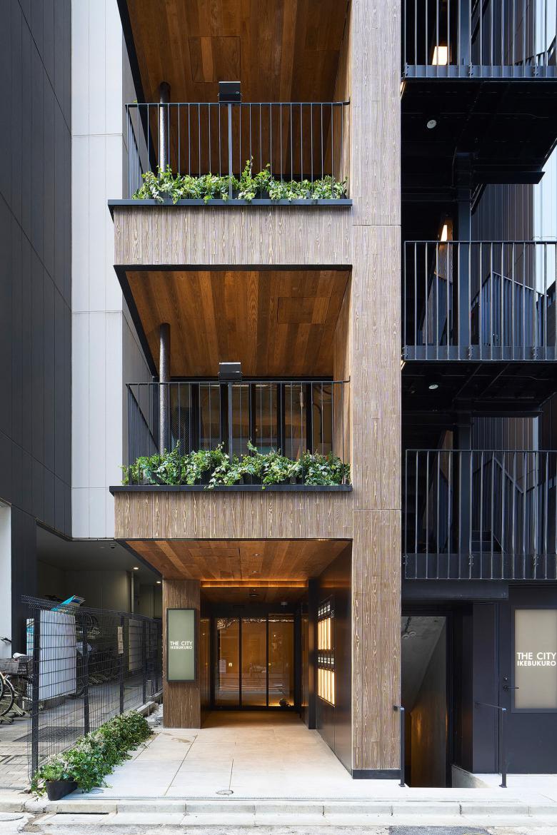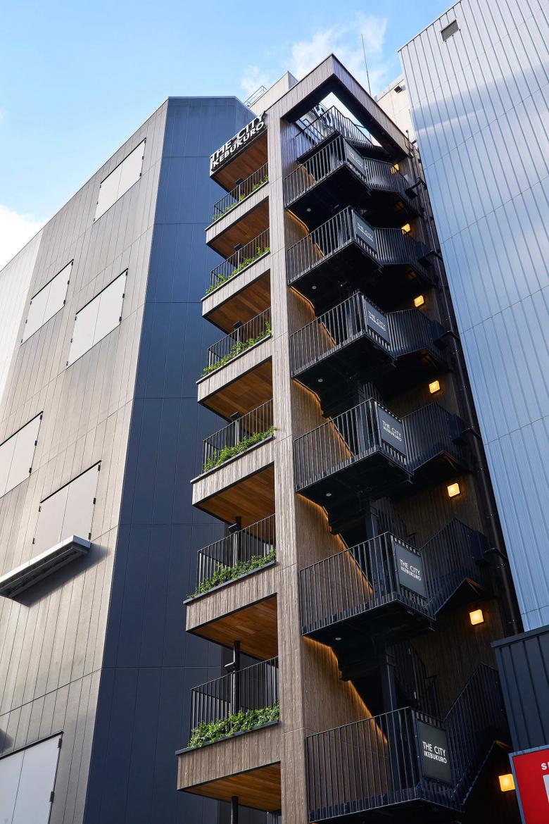 1F部分はこの突出した形状を利用して、人を招き入れるように作られている。よりトラフィックの多いサンシャイン60通り側は共用エレベーターのホールと1F店舗への入り口に誘導するように飛び出している。反対のサンシャイン通り側は屋外避難階段が設置され、地下テナントへの誘導ができる設えとしている。