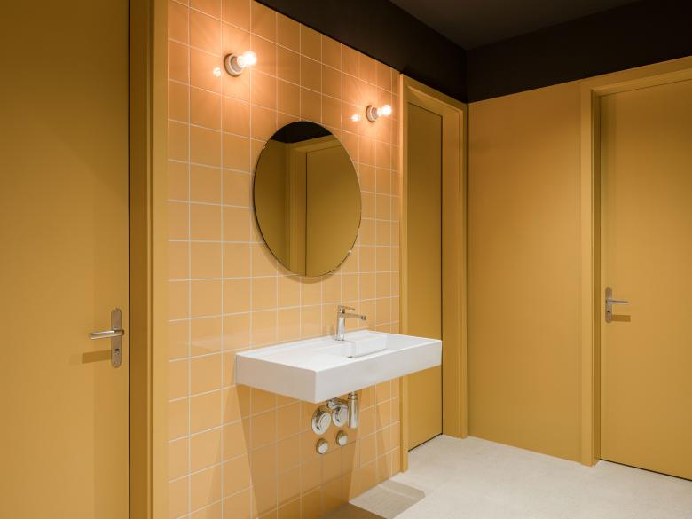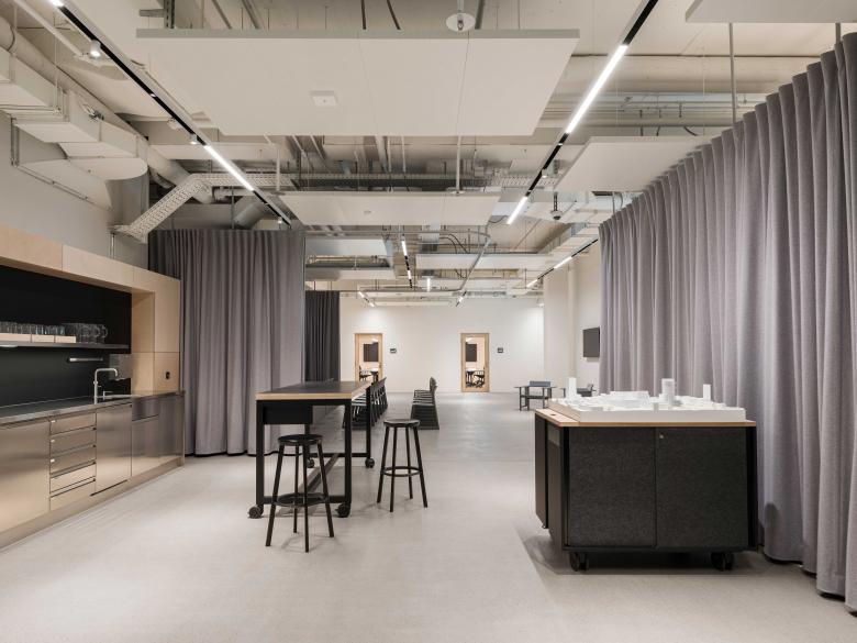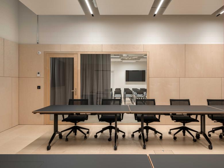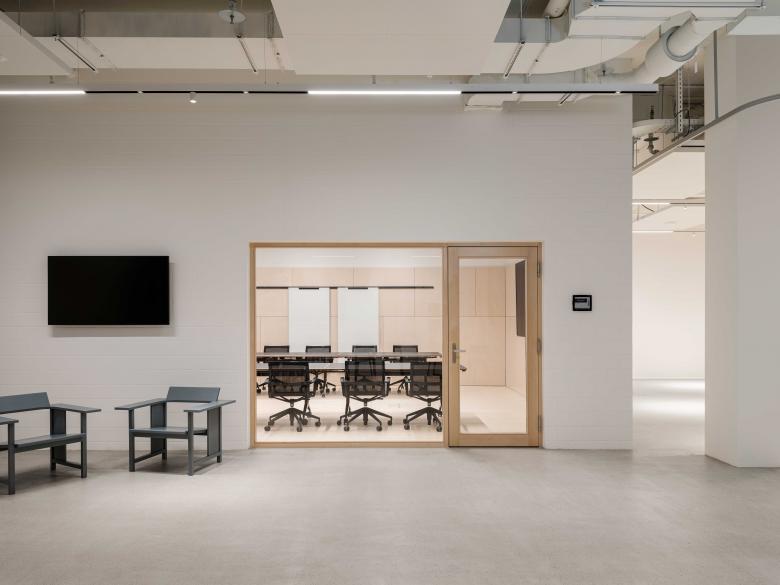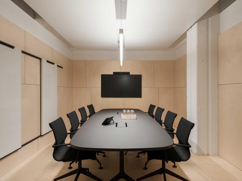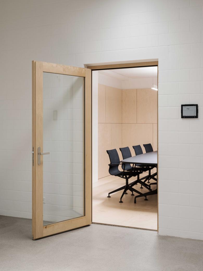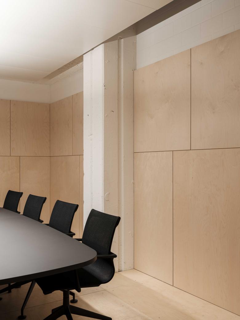 Die Sitzungszimmer wurden mit den charakteristischen Birkenbodenplatten und Wandverkleidungen ausgestattet, wie sie auch in den Bürobereichen zum Einsatz kommen. So entsteht ein wiedererkennbares, kohärentes Raumgefühl. Der angrenzende, fliessende Außenraum ist für Workshops und Ausstellungen konzipiert.