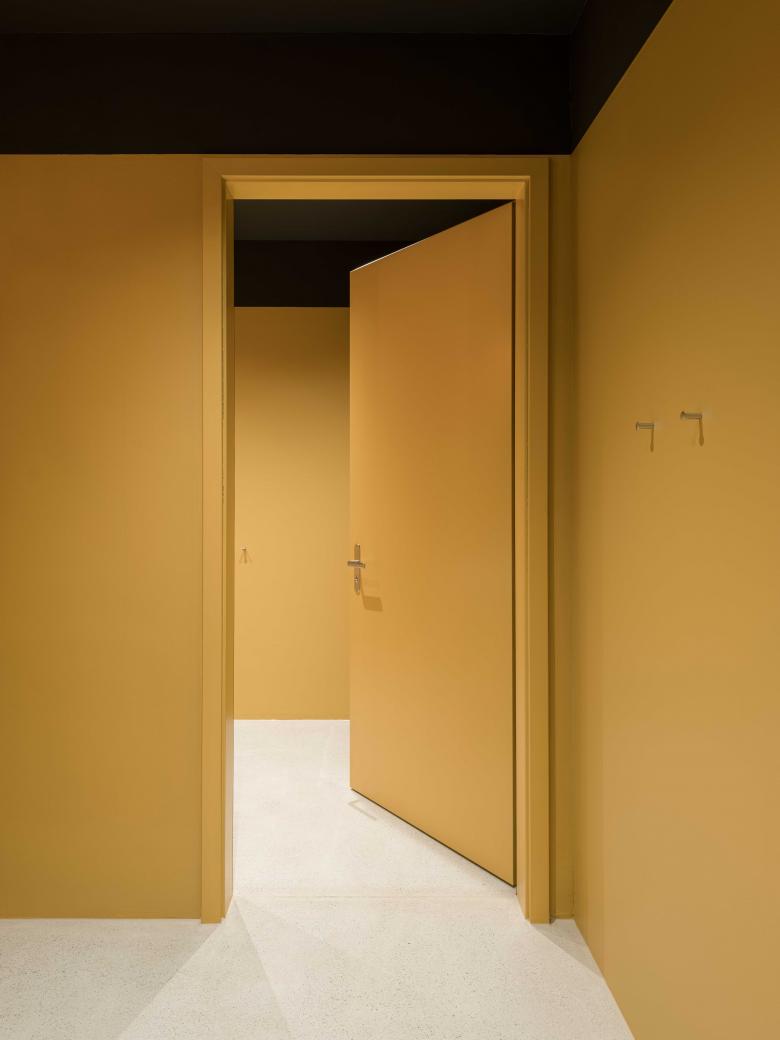 Die Kalksandsteinwände wurden geschlämmt – das heißt, sie erhielten lediglich einen minimalen Putzüberzug und wurden anschließend gestrichen. Diese Technik bewahrt die natürliche Struktur des Mauerwerks, sorgt für ein helles, einladendes Ambiente und schafft eine angenehm warme Atmosphäre, die deutlich freundlicher wirkt als herkömmliche Gipswände. Der Boden im Außenbereich besteht aus geschliffenem Hartbeton, der vielfältige Nutzungsmöglichkeiten für Events oder Vorträge bietet. Durch Vorhänge lassen sich einzelne Zonen und Bereiche flexibel voneinander abtrennen.
