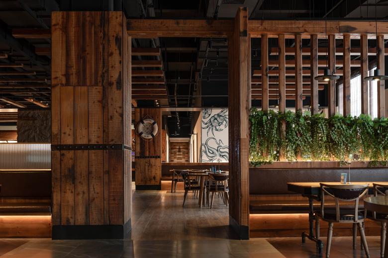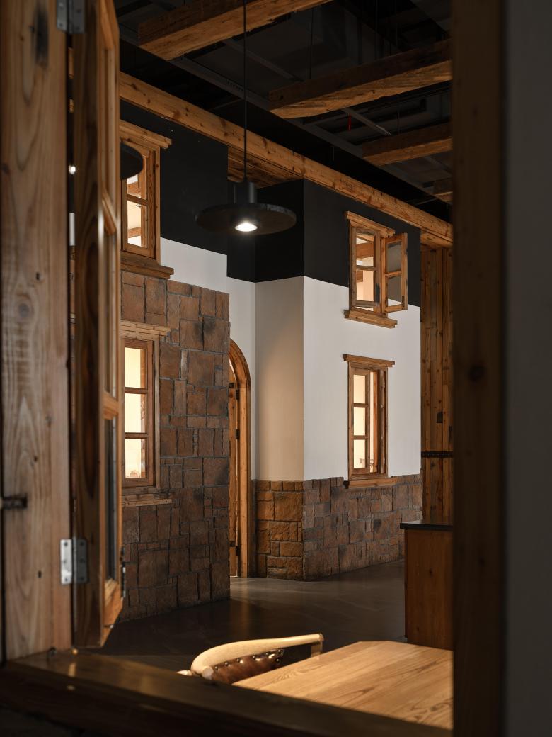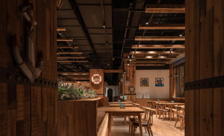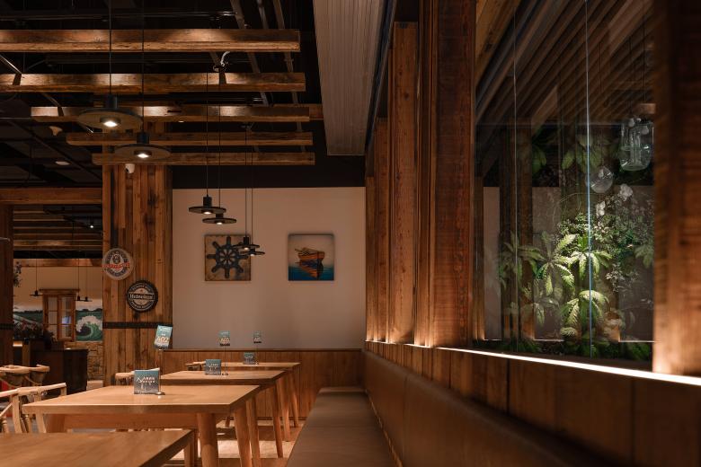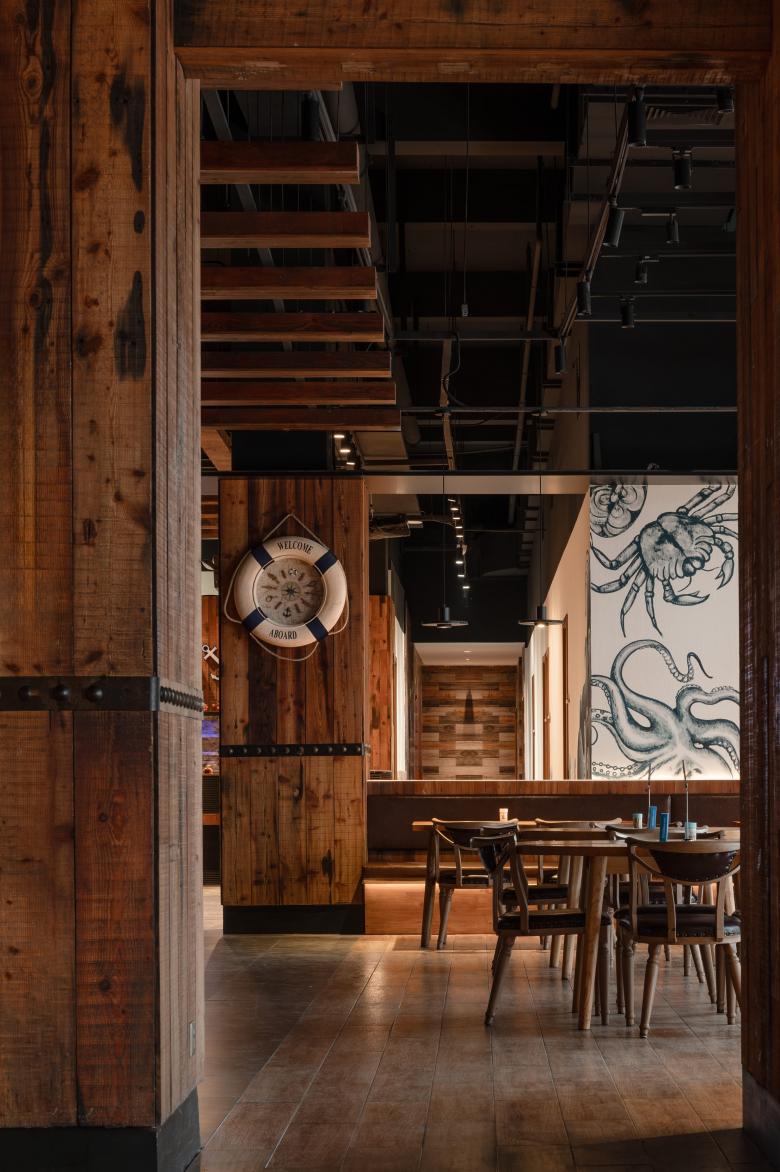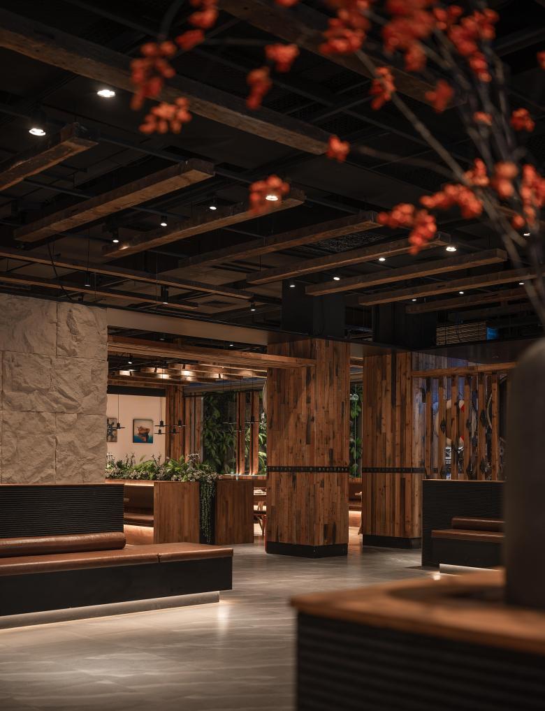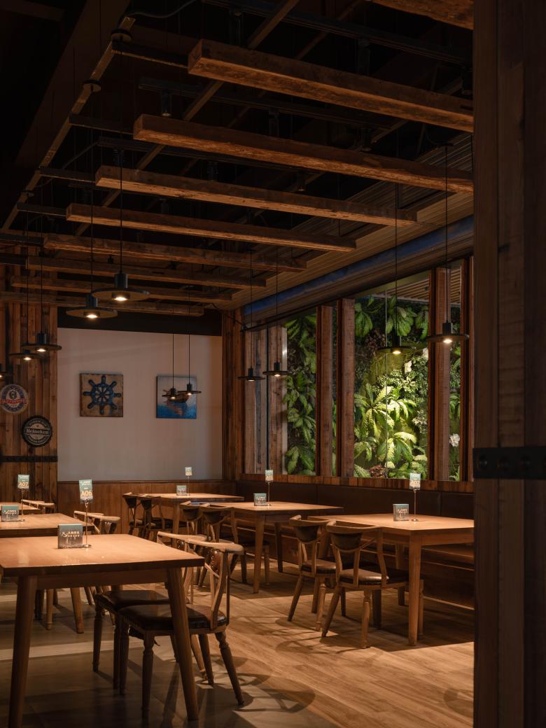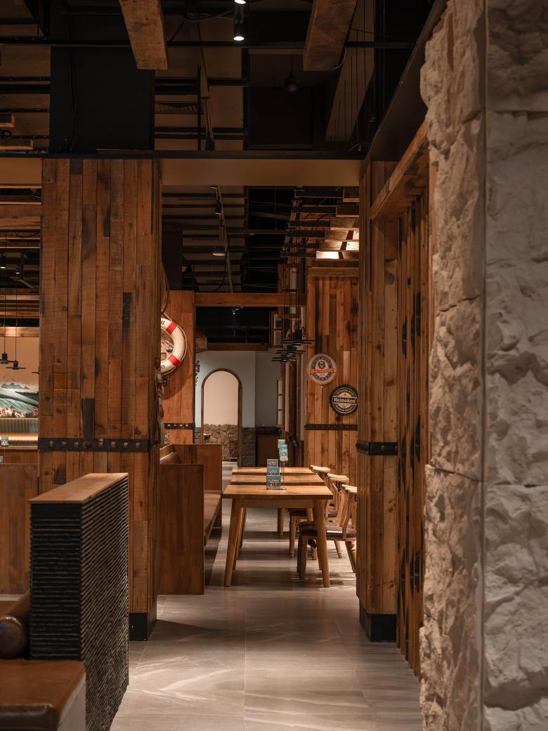 室内空间以“木”为主材核心语言,大量使用回收木料、深色实木板材、旧梁翻修构件构成顶面、隔墙与卡座界面,赋予场所温润肌理感与视觉连续性。墙面采用局部石材覆面与灰泥肌理涂料,呈现出一种接近礁石表面粗粝感的低光泽质地,与木构材质形成冷暖碰撞。