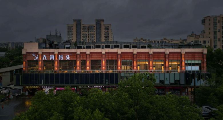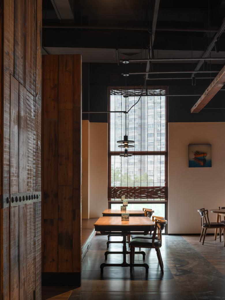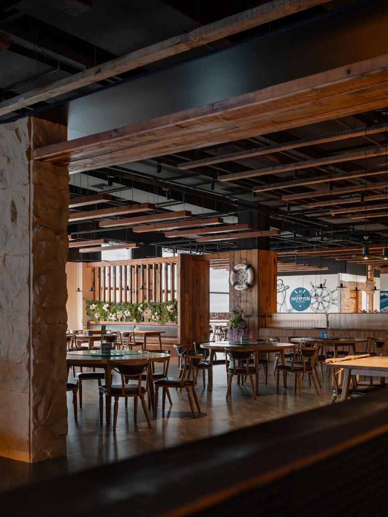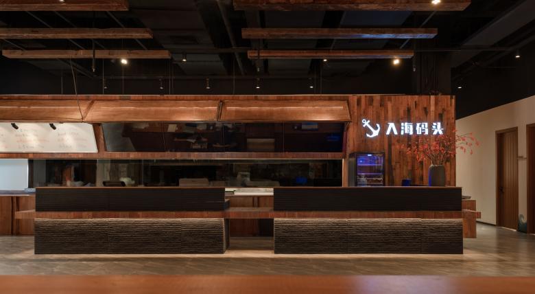 “入海码头”取意于江河入海的集散之地,是人、物与情绪交汇的临界场所。设计不再以符号化方式再现“海鲜”“码头”意象,而是提取其空间精神特征,以“开放、围合、聚集、流动”为组织逻辑,在有限空间中搭建一个具有木构节奏感与石材肌理质感的都市渔港。设计试图在城市街区中构建一个拥有“靠岸感”的日常居所,使海鲜餐饮回归食物本身的新鲜与社交本能的温度。在材质、尺度、光线、界面等一系列构造策略中,设计者强调场所气质的生成,亦回应城市生活中逐渐消失的“公共性食空间”。
