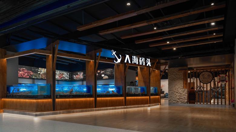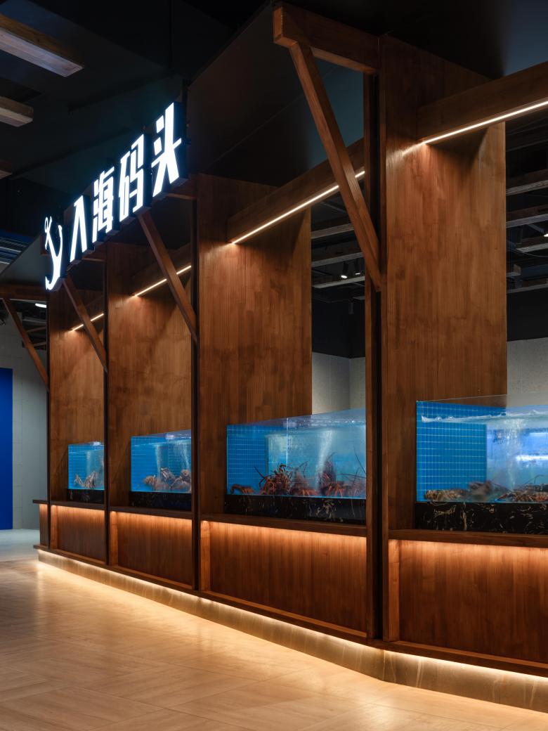 海鲜展示区位于餐厅入口与主厅之间,是连接外部市井气息与内部用餐体验的关键节点。设计以“码头上岸”的动线逻辑打造视觉焦点,设置整面定制蓝色水族玻璃鱼缸,形成类似沿海渔市中“现捞即食”的生鲜体验感。