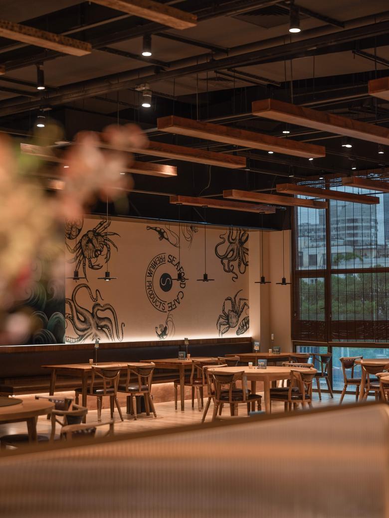——穿行在烟火气中,海鲜展示区与蓝色鱼缸构成半开放的“渔市”现场,记忆中的大排档被重新演绎。