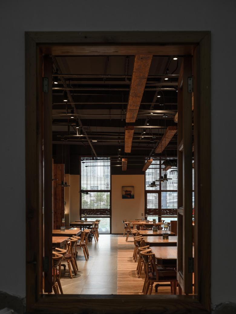 空间内所有餐座均配以定制灯具,灯体隐藏于木梁内或嵌入木框吊装,配合暖光轨道点射,形成独立照明感受,避免大面积泛光产生的光污染,使每一张餐桌都拥有自己的“小气候”。