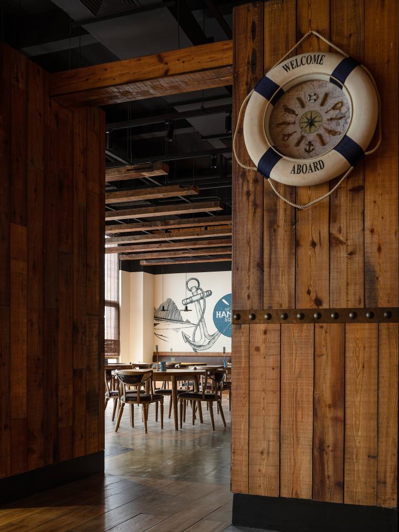 本项目中,吧台作为空间的视觉锚点与功能中枢,被安置于餐厅主轴的交汇处。设计采用整块深色橡木板材,配合哑光处理,保留木材天然肌理与手工打磨痕迹,呈现出质朴沉稳的“船舷感”。吧台立面使用回收木板错缝拼接,形成类似渔船外壳的防水板结构语言,强化“码头”语境下的叙事氛围。