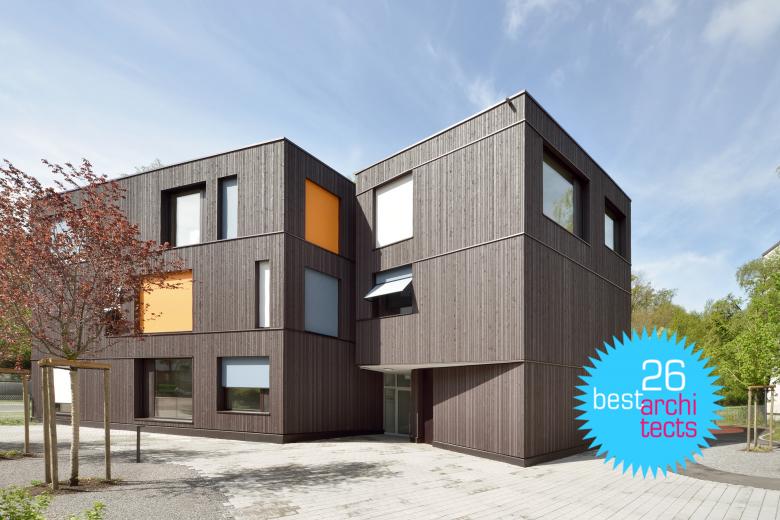 Der dreigeschossige Neubau passt sich durch die polygonale Form präzise in das Grundstück ein und nutzt die bebaubare Fläche effizient. Aufgrund seiner architektonischen Ausformulierung und der starken Farbgebung erhält er einen eigenständigen Charakter und grenzt sich klar von seiner Umgebung ab. Mit der zentralen Setzung auf dem Grundstück wurden umlaufend vielfältige, natürlich gestaltete Aussenräume geschaffen, die von den unterschiedlichen Altersstufen individuell genutzt werden können.