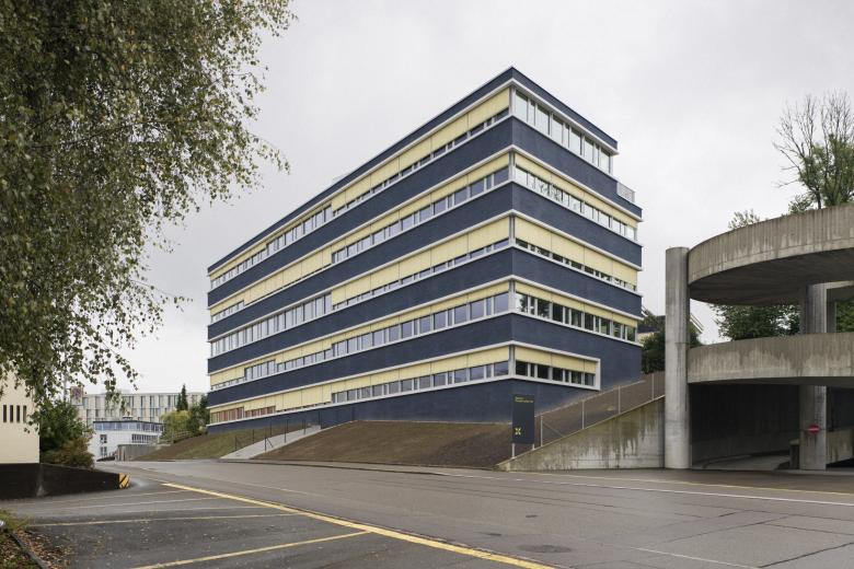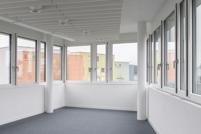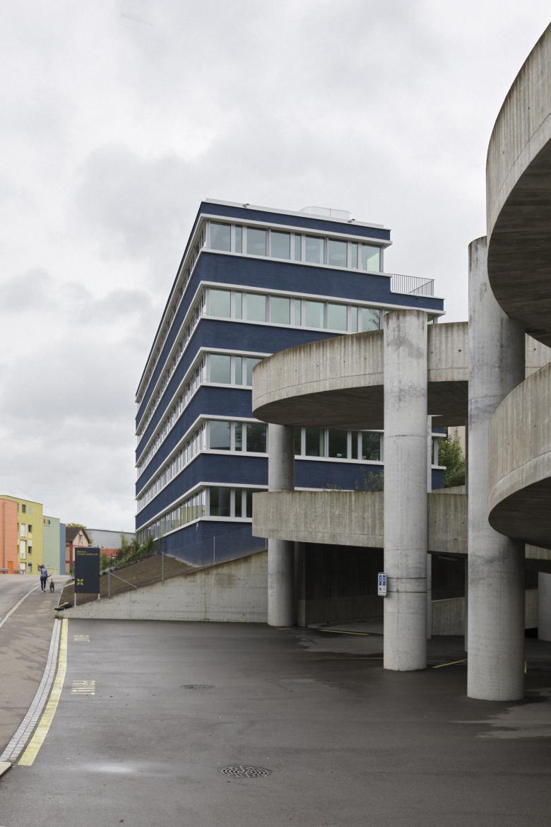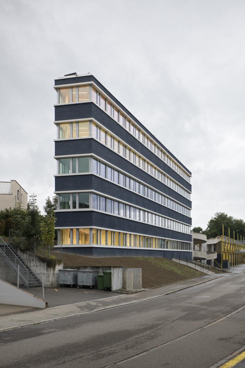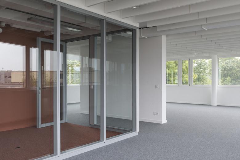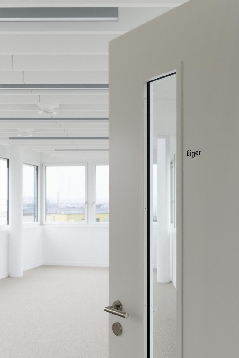 Aufgrund der nur minimal möglichen Abtragung wird das Gebäude über einen in das Gelände führenden Korridor erschlossen. Der offene Grundriss erlaubt eine flexible Nutzung sowie die freie Anpassung an mieterspezifische Ausbaustandards. Der zentral gelegene Kern umfasst die interne Erschliessung sowie die Nasszellen. Als raumtrennendes Element gelesen, erlaubt dieser auch eine Teilflächenvermietung. Lange Bandfenster umlaufen das Gebäude und betonen im Wechseltakt mit den Brüstungen die Horizontale. Der Entwurf überzeugt durch die umfassende Nutzung des minimal erforderlichen Raums, um die individuellen Bedürfnisse der Mieter flexibel umsetzen zu können.