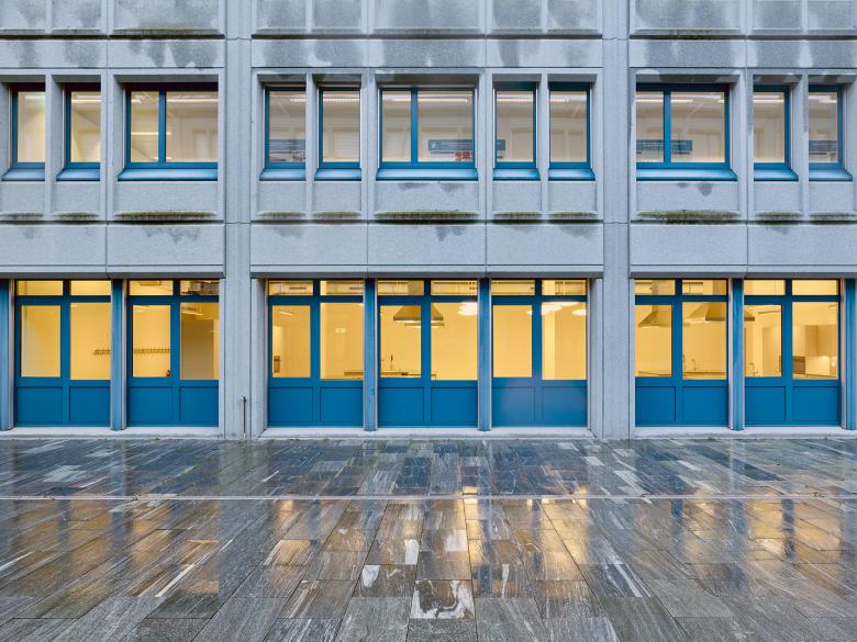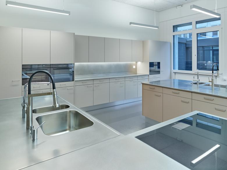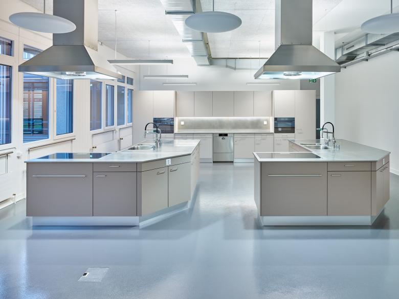 Zwei nebeneinanderliegende Schulküchen mit je vier Kochinseln, Küchenschrankfronten, Waschstrassen und Garderoben benötigen vorallem eine gute Raumlüftung. Lüftungskanäle zu den Abzugshauben, Anschlüsse Sanitär und Elektro über den bestehenden Doppelboden und robuste, unterhaltsarme Oberflächen bilden die Grundlage für den zweckmässigen Einbau. Eine der Küchen kann zudem als Gastroküche für grössere Anlässe genutzt werden.