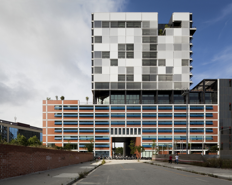 The new offices building for RBA Editors, exhibits two grammatical streams. One related to the form and scale, and the other with the details of their chameleonic façades. Since the irregular form of the building's volume was predetermined by the urban plan, we realized that by drawing a simple rectangular composition in the main façade facing west – similar to the compositions of painter Piet Mondrian – the rectangle of the upper levels could float above its base. The terrace remaining in the space between the two rectangles could become an ideal space for social open air activities of the company. With this decision the lower rectangle, corresponding to the city's street architecture, could be detailed to a more human scale, in contrast to a more metropolitan scale of the upper rectangle. The other grammatical stream concerned the different solutions corresponding to the orientation of the façades. The narrow North facade facing the main avenue did not require any protecting element, so it could be fully glazed. Instead, the long facade facing west, must be protected from the intense heat and light of the afternoon sun. The floor to floor “brise soleil” (sun breakers) respond to its metropolitan scale, and the detailed silicon serigraphied glass shades protecting the slightly tinted glass in the horizontal windows introduce a more human relationship with the street. In the narrow south facade, horizontal terraces prevent vertical penetration of the midday sun. The east façade, protected by the office building situated ten meters away, did not require sun protection. Another factor was the reference to the neighborhood's industrial past, expressed by identifying a simple structure frame with white aluminum profiles and a light-weight colored ceramic panel, referring to the few surviving brick factories. The project consists of an office building of 19,000 m2 – 17 floors high and 4 basement levels for parking – with façade in Diagonal Avenue and Roc Boronat Street, located in the new 22@ district of Poblenou. It has a pedestrian passageway that crosses the building in their three first floors, two entries in the ground floor and two vertical access nucleus. The public spaces are placed in the intermediate floors with an auditorium hall with terrace for the social activities of the publisher. In the highest floors are the executive offices and the library.
