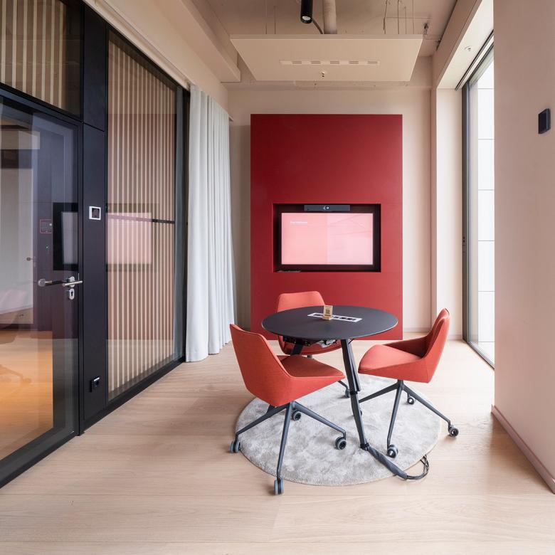 teilweise zurückgebaut, teilweise im Cradle-to-Cradle Prinzip weiterverkauft, und als organische „Spielflächen“ mit multifunktionalen Räumlichkeiten sowie einer offenen Sitz- und Möbellandschaft mit Bar umgenutzt. Natürliche Materialien wie Holz, Pflanzen und Moos, dezente Farben und geschwungene Formen vermitteln eine einladende und entspannte Atmosphäre. Im Kontrast zum hektischen Büroalltag sorgt der hochwertige Raum für innere Ruhe und Entschleunigung. Nichtsdestotrotz können Besprechungen in den drei unterschiedlich großen Konferenzräumen stattfinden, während kleiner zonierte Bereiche für konzentriertes