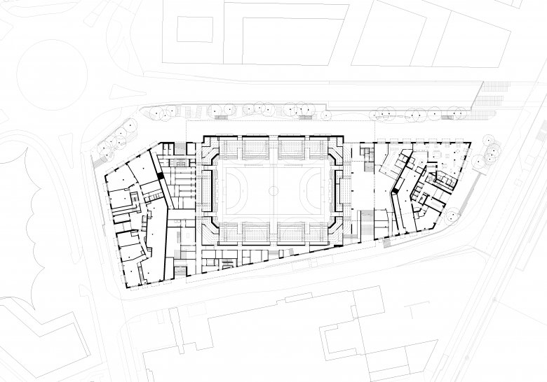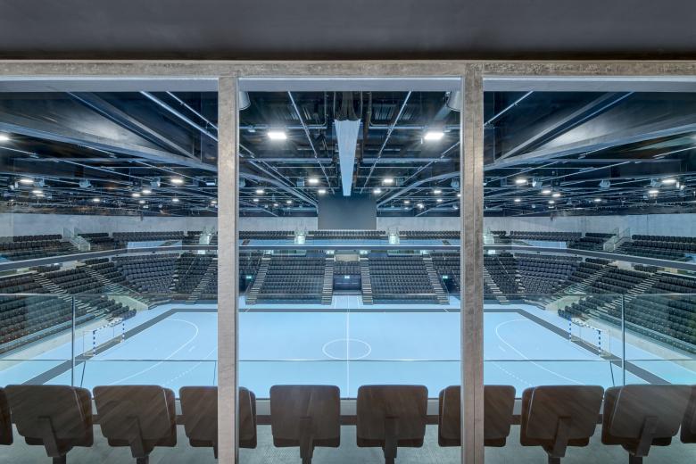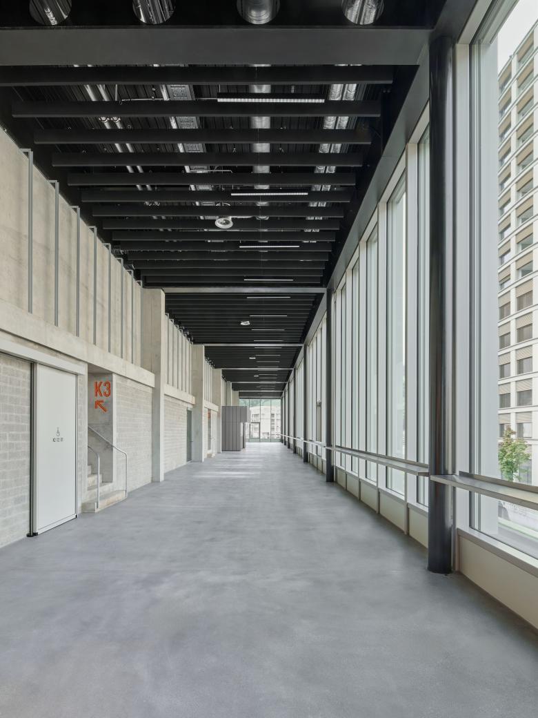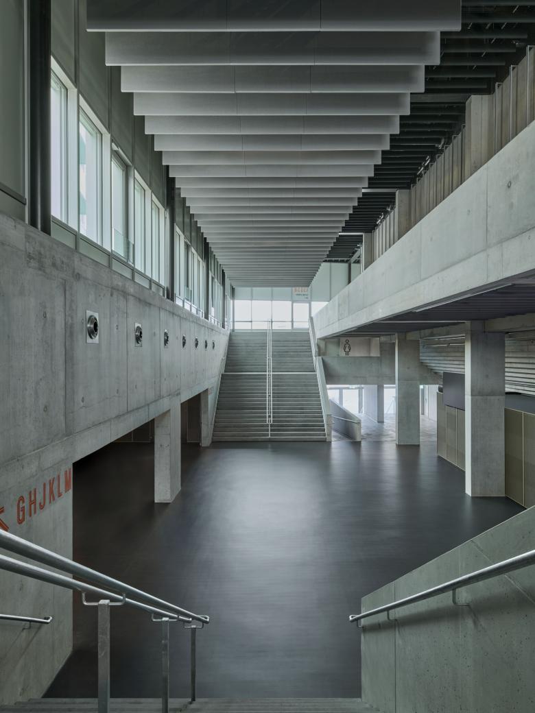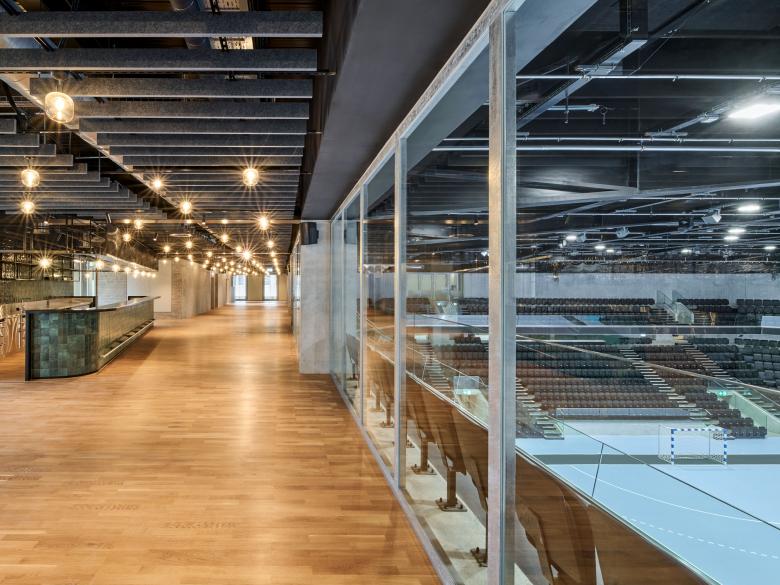 Das erhöhte Foyer der Arena erscheint als verglaster Stadtbalkon, welcher über dem Sockel schwebt und den Blick auf Promenade und Quartier freigibt. Die Verglasung ist fein vertikal gegliedert und verleiht der Arena eine laternenhafte Erscheinung. Die Wohntürme erhalten durch die zweigeschossige Gliederung und Rhythmisierung mit Pfeilern, Gesimsen und Wandflächen eine angemessene architektonische Erscheinung.