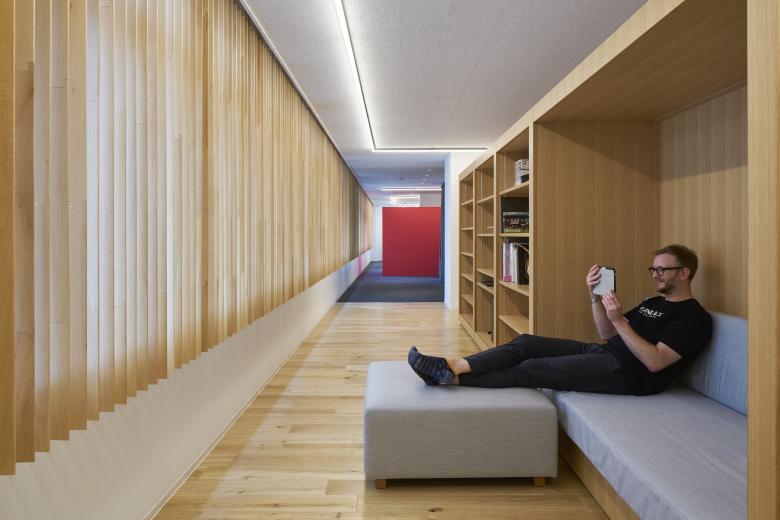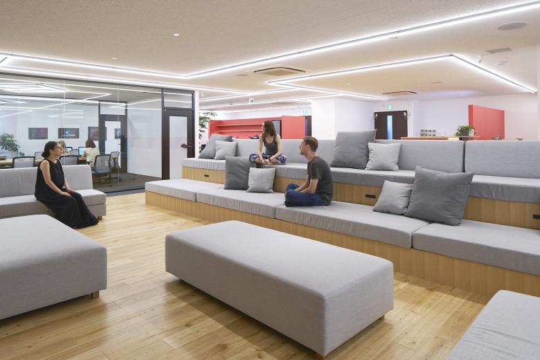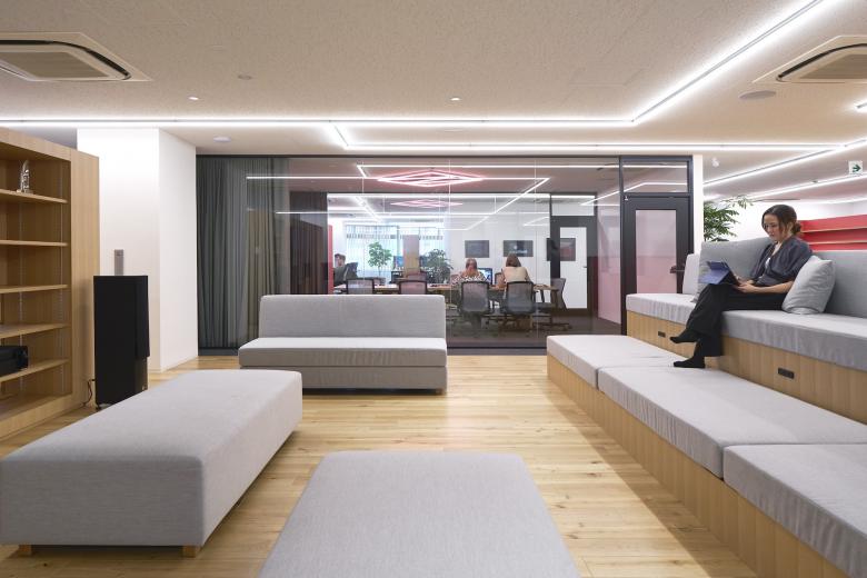 パブリックな空間が社員を受け入れ、奥に行けば行くほどプライベートな空間が広がる。ウェルビーイングルームでの瞑想や昼寝。リビングルームでの映画鑑賞やストレッチ。ライブラリーでの読書やリサーチ。キッチンでの一杯のコーヒーや同僚とのおしゃべり。オフィスの中での散歩。仕事に行き詰まったら、どんな過ごし方であってもこのオフィスは自然と受け入れてくれる。どんなアイディアも生き方もアイデンティティも受け入れてくれるという安心感が前向きな気持ちに繋がる。ここには行き止まりがない。そして彼らのアイディアにも行き止まりなく広がる場としている。