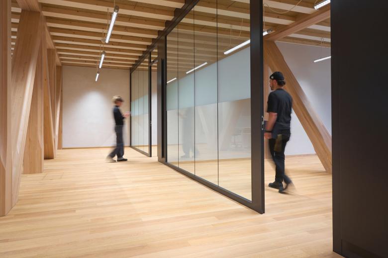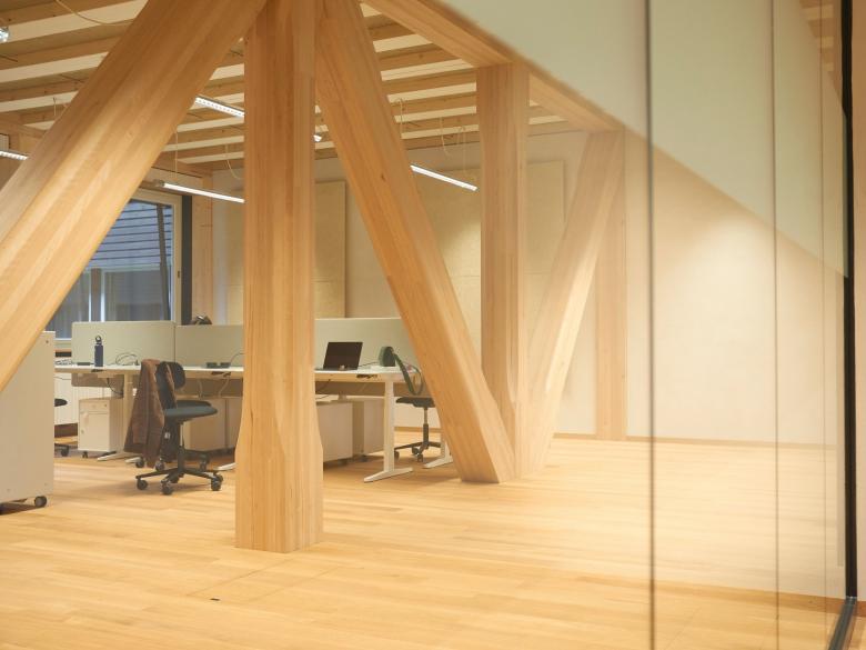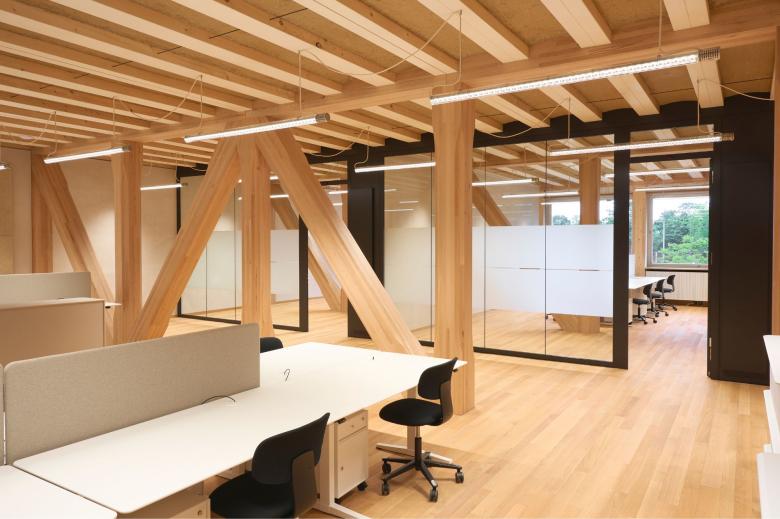 Entworfen von den Kolleg:innen von Herzog & de Meuron, setzt das Büroensemble neue Massstäbe in Sachen Nachhaltigkeit. Verbaut wurden konsequent erneuerbare und recycelbare Materialien mit dem Ziel, 30 Jahre nach der Errichtung energiepositiv zu sein. Die gesamte Energie, die beim Bau des Gebäudes eingesetzt wurde, soll sich bis zu diesem Zeitpunkt vollständig amortisiert haben – ein Meilenstein nachhaltigen Bauens.