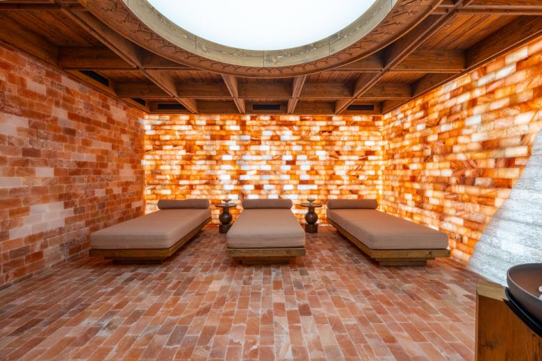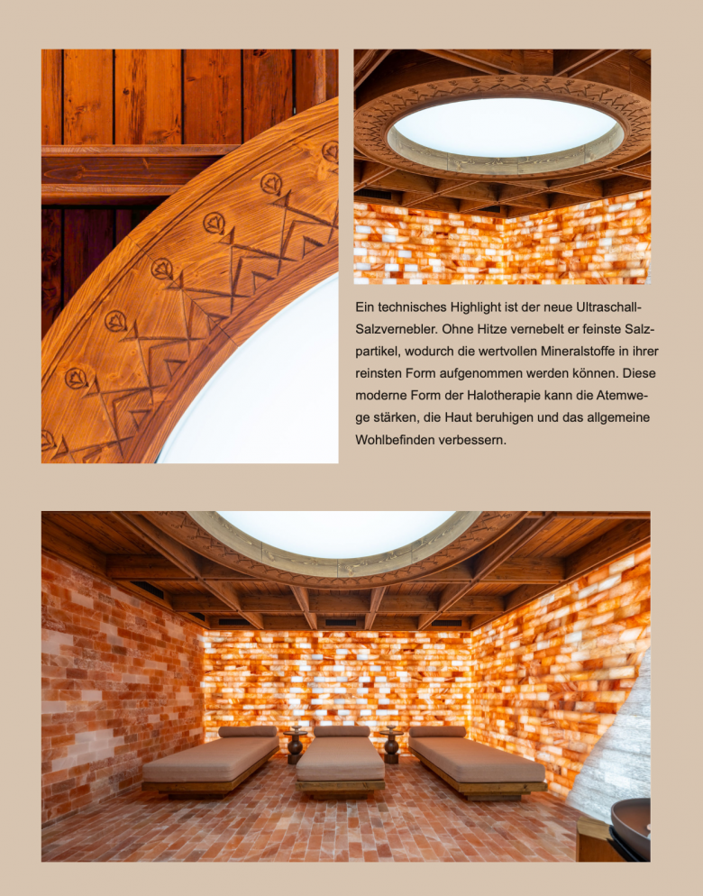 Im Einklang mit dieser Philosophie ist ein ganz besonderer Rückzugsort entstanden: der neue Salzraum im Spa-Bereich des Hauses.Im Zentrum des gestalterischen Konzepts steht die kraftvolle Wirkung natürlicher Materialien. Beson- ders eindrucksvoll: die hinterleuchteten Salzstein- wände, die ein sanftes, mineralisches Leuchten verströmen und dem Raum eine wohltuende Tiefe verleihen. Die Decke aus Altholz bringt alpine Ur- sprünglichkeit ins Spiel, während ein rundes „Tunable White“-Lichtfeld den natürlichen Verlauf des Tageslichts nachbildet – eine subtile Unterstüt- zung für innere Ausgeglichenheit.