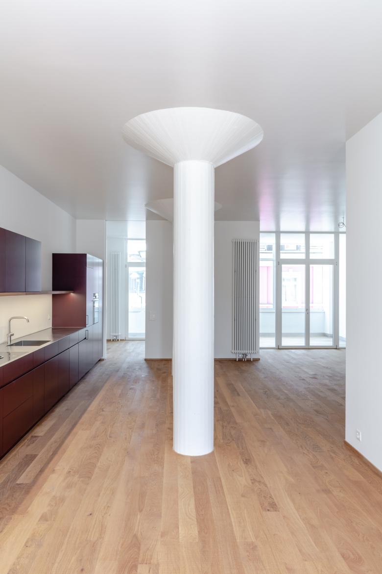 Ein bestehendes Druckereigebäude in der Innenstadt - bestehend aus Fabrikationshalle und Bürotrakt - wird in Wohnnutzung übergeführt. Der durch die industrielle Nutzung bestimmte Charakter des Bestands wird zu einem tragenden Entwurfsthema und wird auch in der neuen Nutzung weiter spürbar sein. Die Direktheit der Tragkonstruktion, Pilzkopfstützen, Rippendecken und Besonderheiten wie die Stahlkonstruktion des Sheddachs werden mit wenigen neuen Elementen und Materialien ergänzt und so neun Loftwohnungen in die Bestandvolumetrie eingeschrieben.