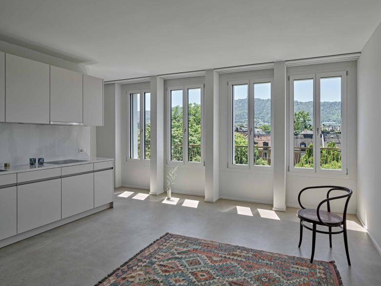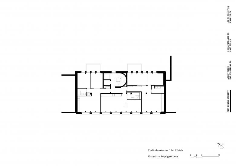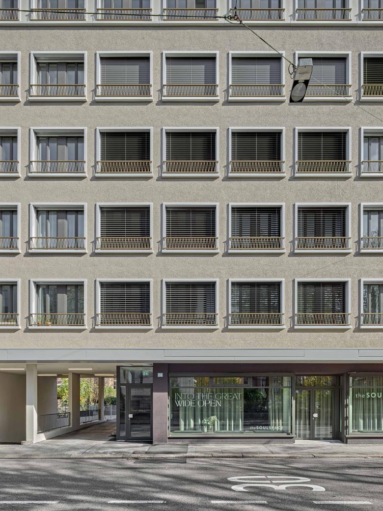 An der Zurlindenstrasse drängen sich die Häuser dicht an dicht zum Block. Dass das Grösste in der Strassenzeile umgebaut wurde, verrät auf die Schnelle nur der zweite Blick. In längerem Prozess und diversen Studien wurde untersucht, wie sich das Ziel, das Bürohaus anno 1970 einer Wohnnutzung zuzuführen, mit vertretbarem Aufwand erreichen liesse. Im Austausch mit der Stadt wurden sämtliche Potenziale ausgelotet (Dach anheben: nein, Vorhangfassade ersetzen: ja), um Anpassungen an Wohnbedürfnisse vorzunehmen. Für letztere erwiesen sich die Raumhöhen von bis zu 2.75 m als spezieller «Luxus», der sich bei einem Neubau so kaum mehr verwirklichen liesse.