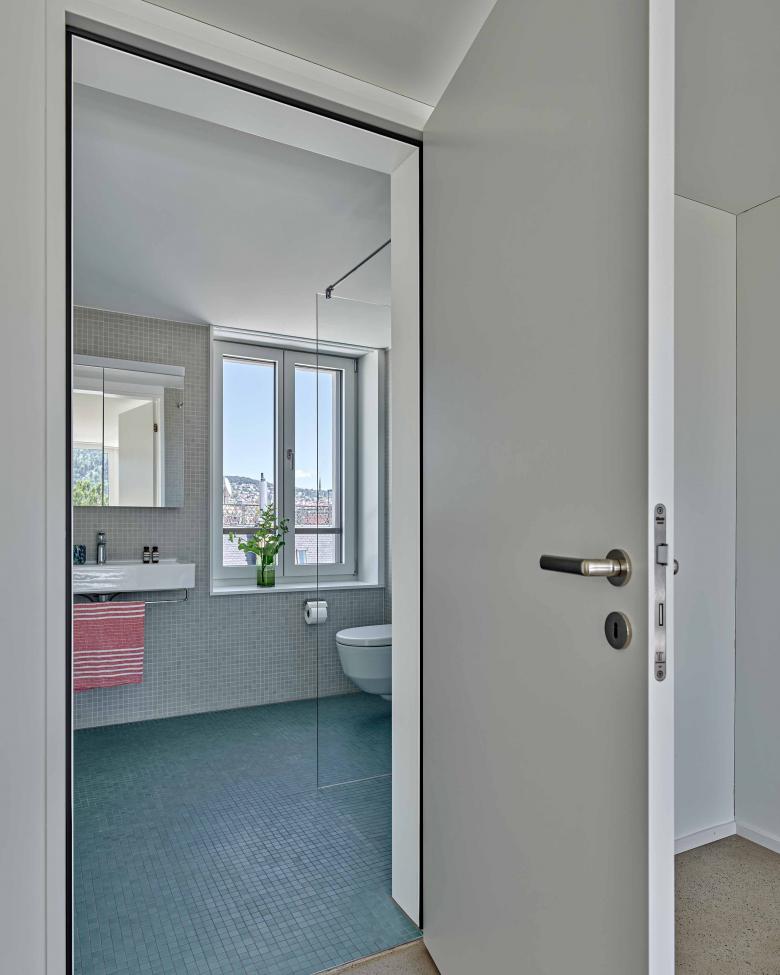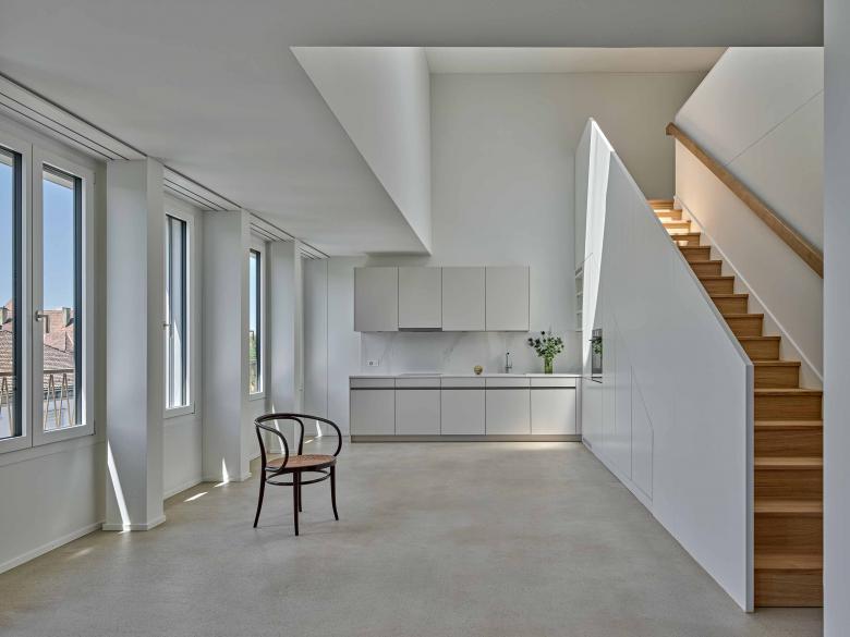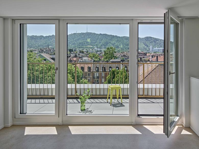 Die obersten zwei Etagen sind zu drei Maisonette-Wohnungen zusammengefasst. Von aussen zeigen sich die neuen Fassaden in zeitloser Gestalt. Dahinter stand lange die Frage, was auf die bestehende Vorhangfassade folgen sollte: Der Entscheid, die Hülle in gleicher Manier zu errichten, führte zu einer Holzelementkonstruktion – und Flächengewinnen. So zeigt sich das einstige Bürohaus an der Strasse in einer wohntypischen Lochfassade, ohne seine Raster-Herkunft zu negieren. Zudem versucht eine visuelle Klammer die obersten zwei Geschosse zu ducken, um zu den tieferen Nachbarn zu vermitteln. Die Hofseite ist mit Einzelfenstern und Balkonen in würdevoller Strenge maskiert. (mc)