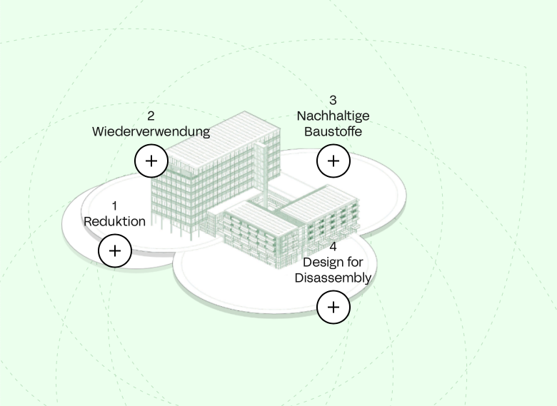 Die nachhaltigste Architektur ist bekanntlich jene, die nicht neu gebaut wird. Deshalb wird der Sockel – die ehemalige Produktionshalle – transformiert und zu Wohnungen umgenutzt. Die Gebäudestruktur aus Sockel, Längsbau und Erschließungsturm bleibt weitestgehend erhalten. Ein neuer Innenhof im Sockelbau sowie partielle Aufstockungen auf diesem Sockelvolumen definieren die notwendige und verträgliche Eingriffstiefe. Diese ist reduziert, aber nicht verzichtend, sondern Potenziale ausschöpfend. Neues wird entweder aus wiederverwendeten Bauteilen oder recycelten wie auch biobasierten Baustoffen realisiert; im Hinblick auf weitere Nutzungen erfolgt dies immer systemgetrennt.
