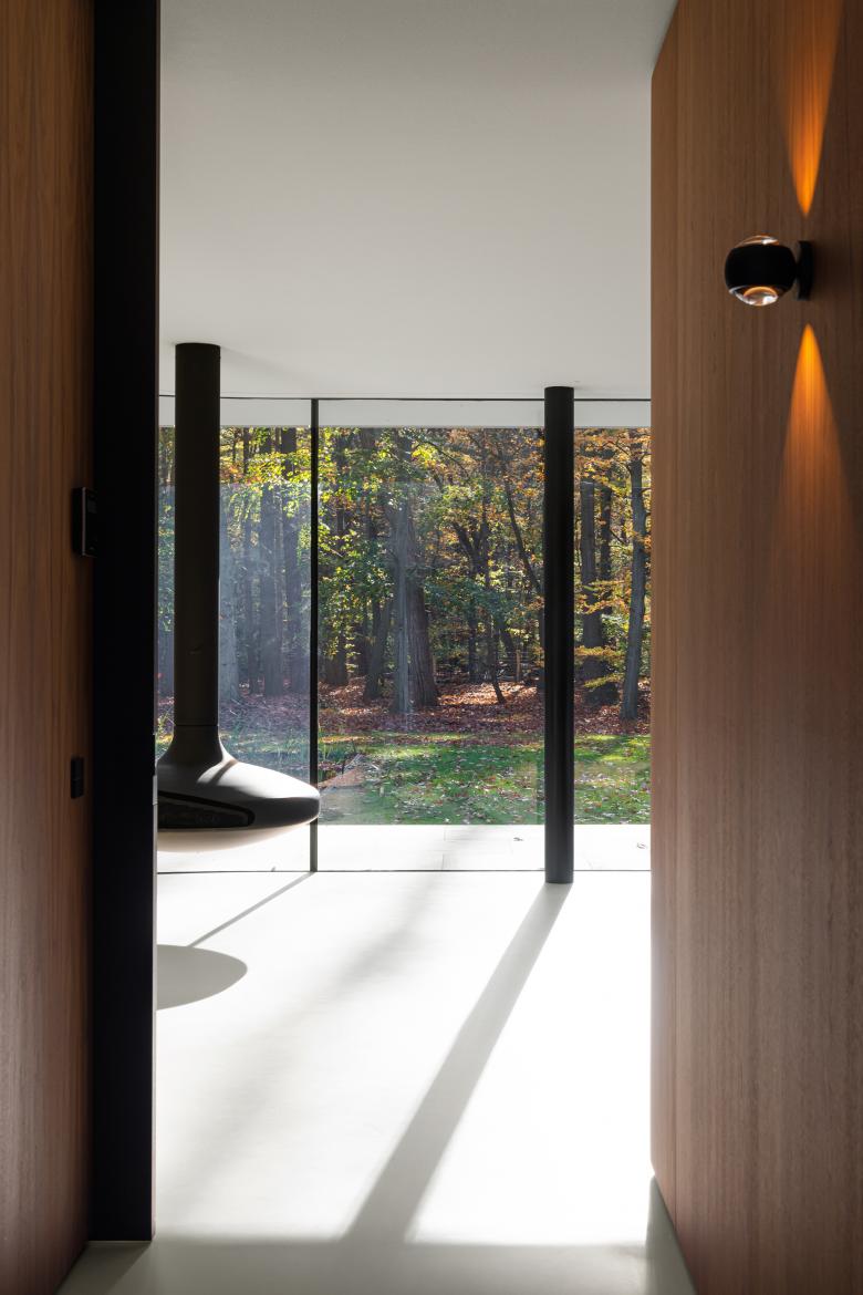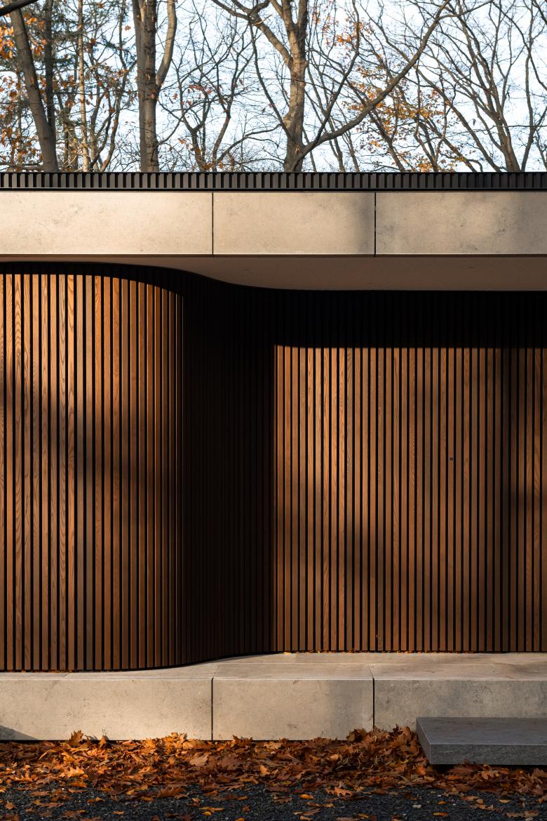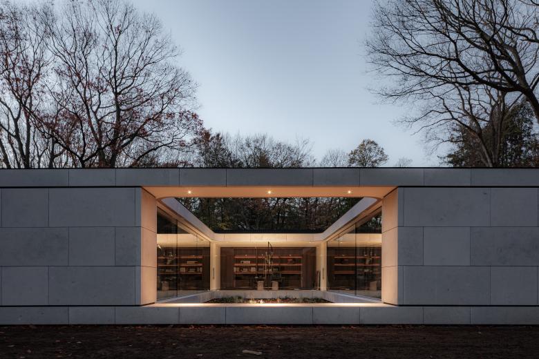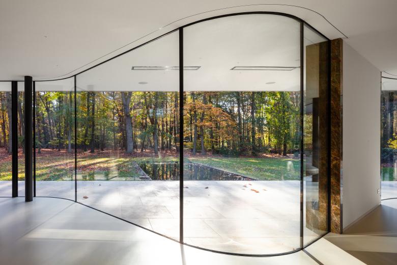 Based on an elongated U-shaped floorplan, our Villa JM presents a secretive stone face to the world, revealing only a tantalizing glimpse of its inner world in the shape of its central courtyard. Inspired by the location, an extensive wooded site in the south of the Netherlands, we discreetly positioned expanses of glass to offer our clients the best of the natural views, while closed volumes safeguard their privacy. Natural stone and wood add depth to our elementary one-story design, which pairs sober straight lines and monumental volumes with seductive curves and sinuous glass walls.