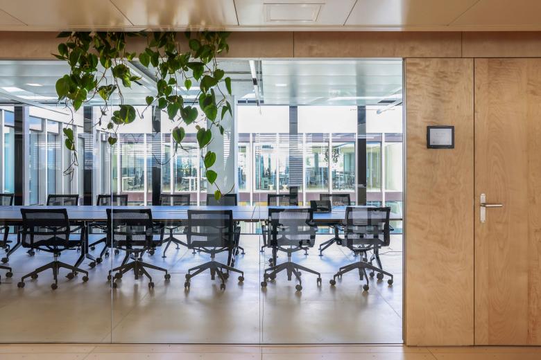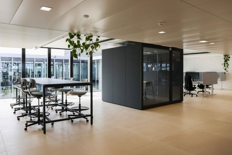 Im Vergleich zu den Regelgeschossen von Implenia war der Bedarf an Meetingräumen und Arbeitsplätzen bei Wincasa deutlich höher. Daher setzte dopo mit den Talkys vermehrt auf Raum-in-Raum-Lösungen, die als flexible Besprechungsräume dienen. Durch diese modularen Lösungen konnte die Anzahl der festgebauten Räume reduziert und die Flexibilität für die Zukunft erhöht werden. Eine der vier an das Atrium angrenzenden Flächen wurde zu einem großen, repräsentativen Konferenz- und Workshopraum ausgebaut. Die gesamte Möblierung wurde so gewählt, dass sie ein dynamisches Arbeiten ermöglicht und Veränderungen nicht nur zulässt, sondern aktiv unterstützt.