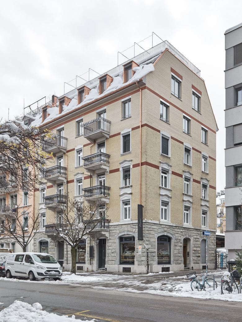 Geschoss ergänzt. Dadurch entstanden drei neue, grosszügige Wohnungen im neuen Regel-, sowie im Dachgeschoss. Die bestehende Fassadengestaltung aus Natursteinsockel mit grossen Fensteröffnungen und mit Klinker verblendeten Mittelteil, wurden im obersten Geschoss mit einer Klinkerschale ohne Fenstergewände abgeschlossen.