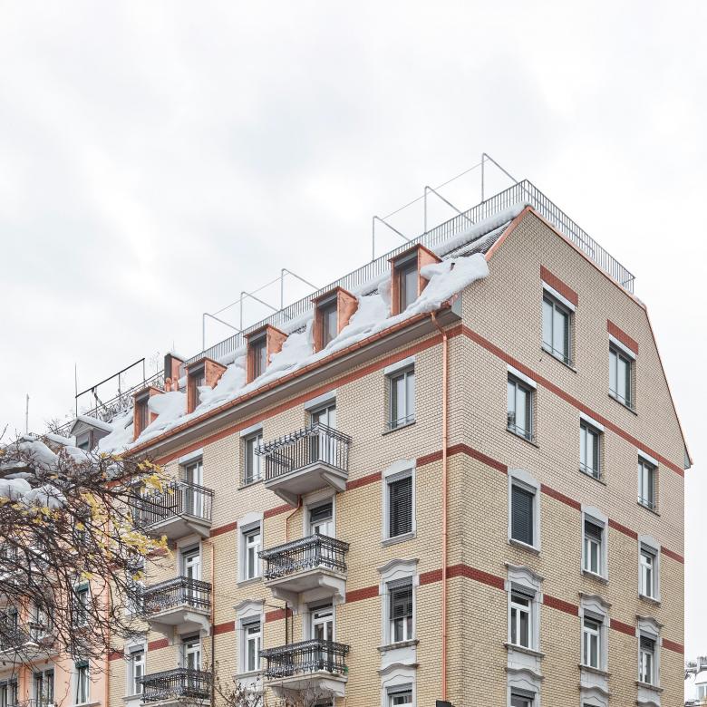 Der Aufbau des obersten Geschosses wurde als Holzbau ausgeführt und nur mit einer hinterlüfteten Klinkerschale verblendet, wodurch die neue Aufstockung nur auf den zweiten Blick als solche erkennbar wird. Hofseitig wurde ein Lift an die vergrösserten Balkone der bestehenden Wohnungen angebaut. Dadurch sind diese rollstuhlgängig.