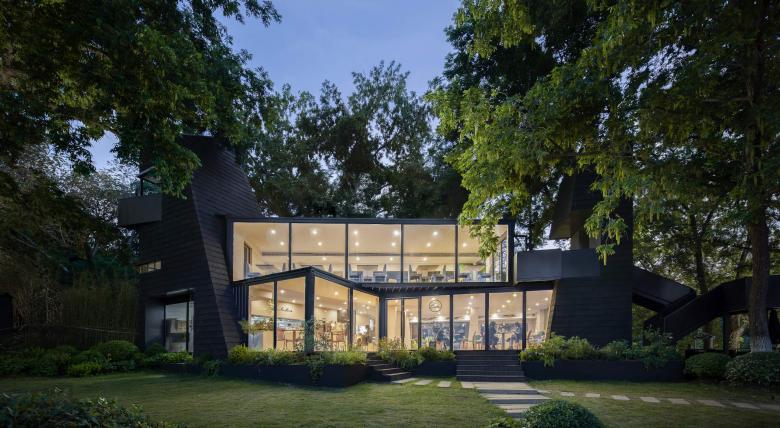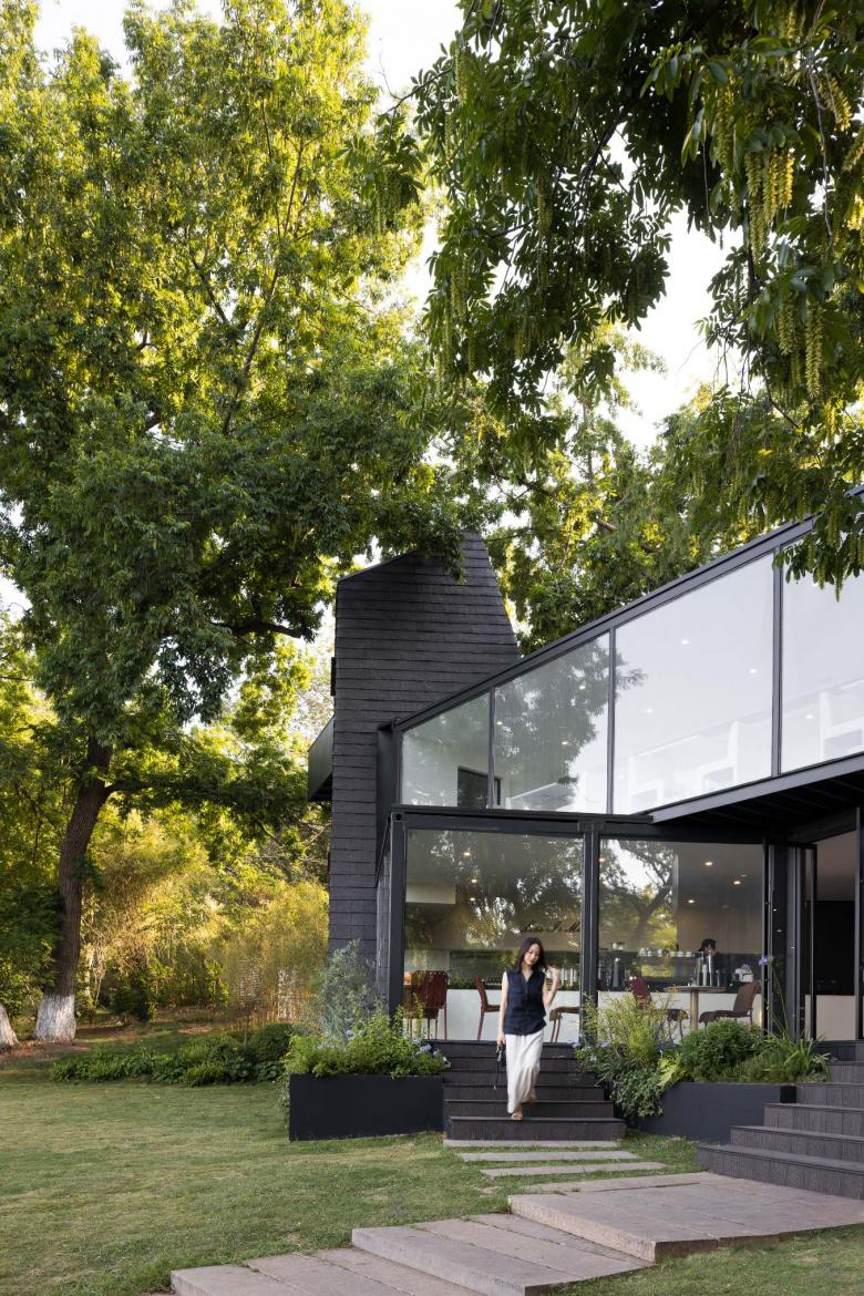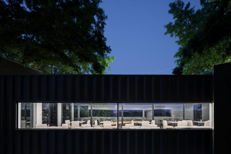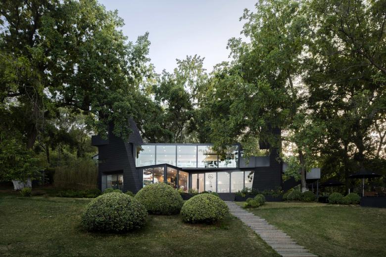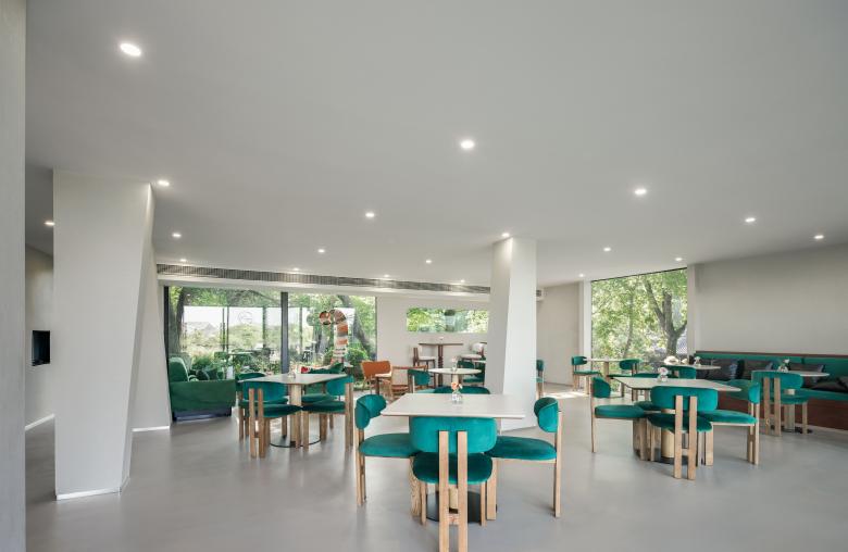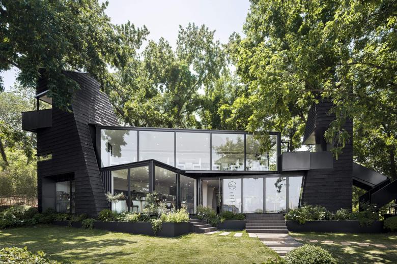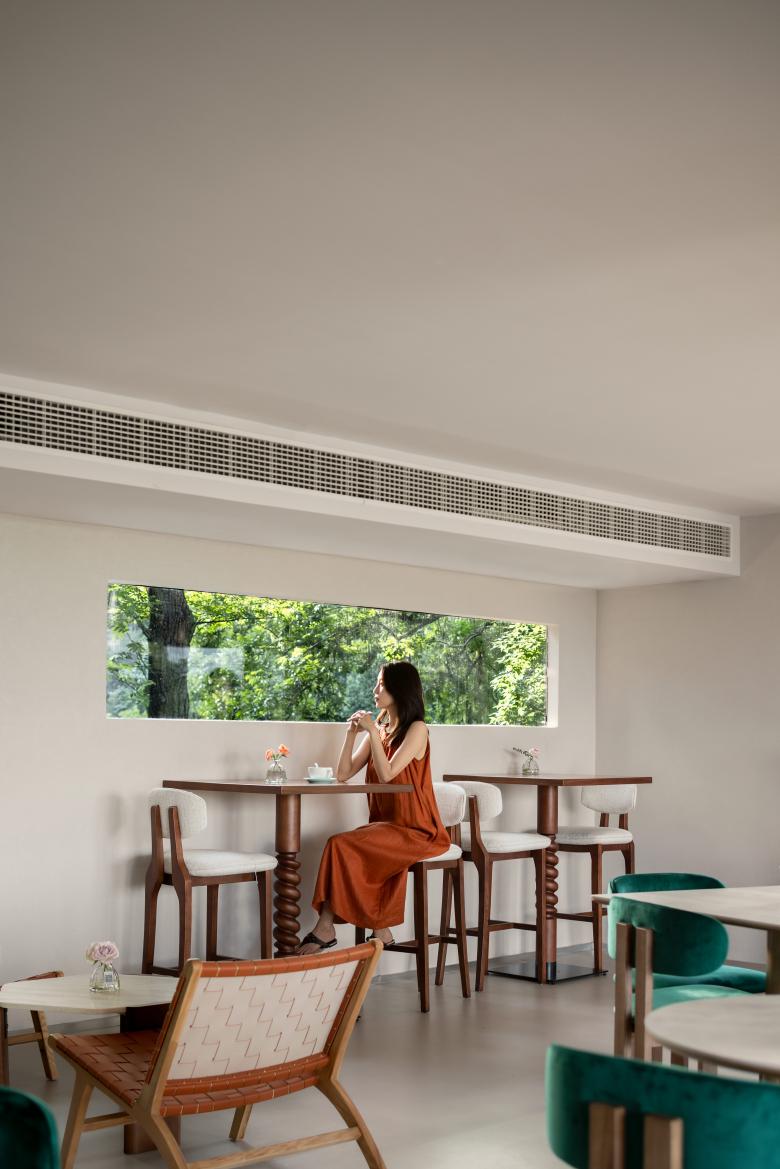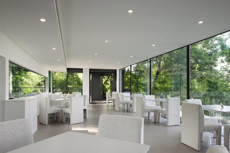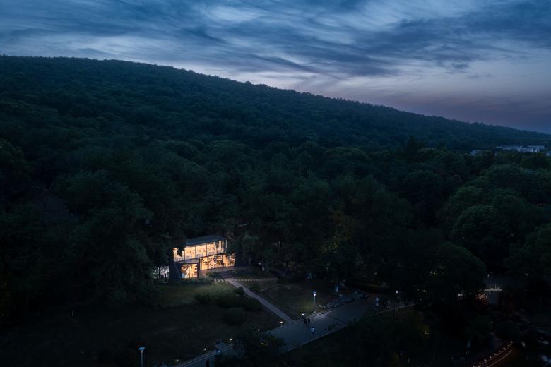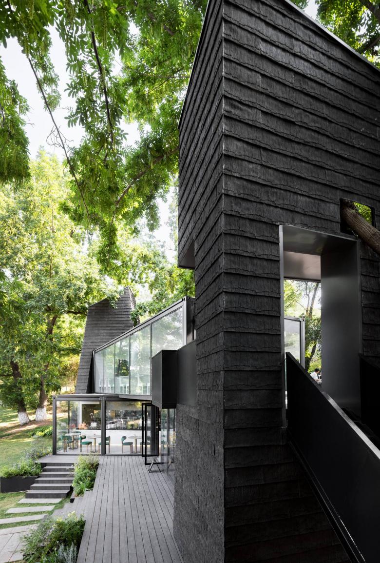北塔·林间私语。隐匿在树林边缘的北塔是最具私密性的存在。二层高的空间全部作为独立包间使用。最特别的是,我们保留了场地原有的两棵山茶树,让它们的枝干从塔楼中部穿出,春季开花时,绯红的花朵会从钢结构的缝隙中探入室内。包间的条窗经过特殊高度设计,既能保证隐私,又能将室外景观的动态尽收眼底。