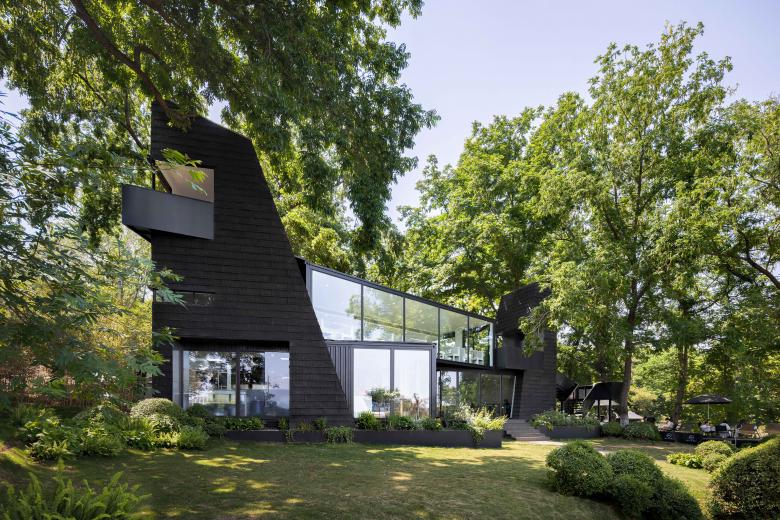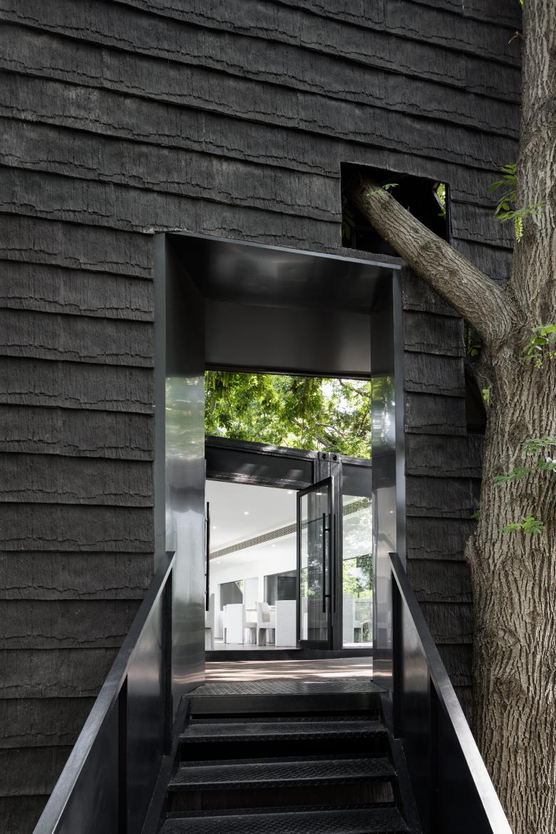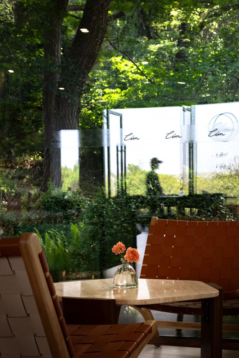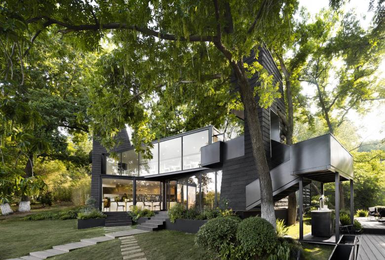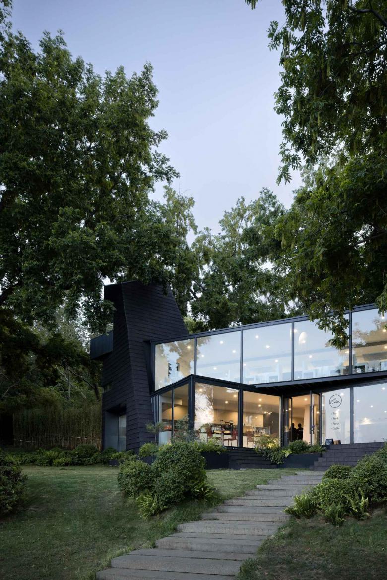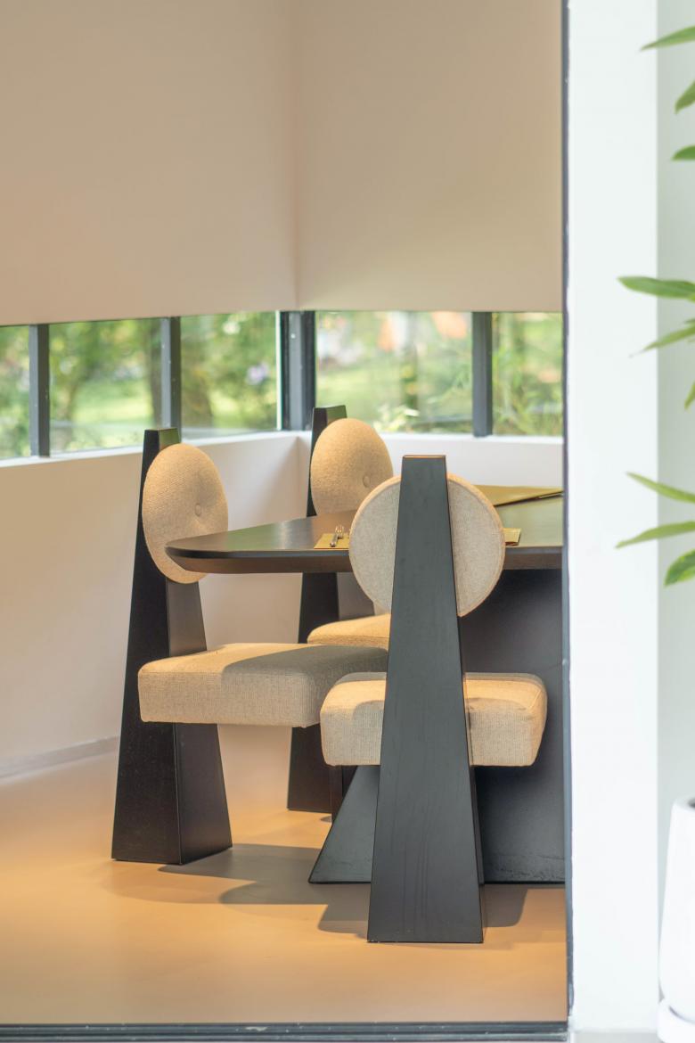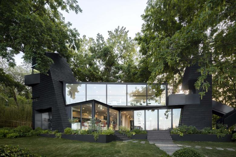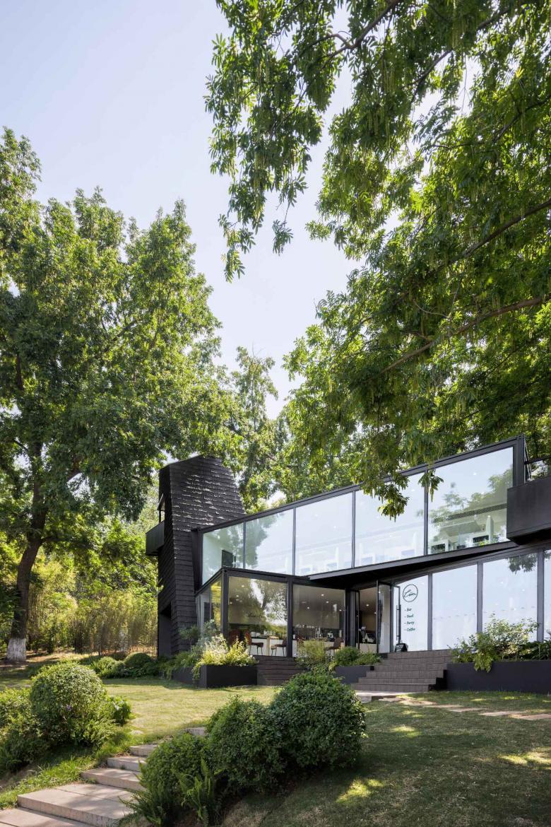 北塔·林间私语。隐匿在树林边缘的北塔是最具私密性的存在。二层高的空间全部作为独立包间使用。最特别的是,我们保留了场地原有的两棵山茶树,让它们的枝干从塔楼中部穿出,春季开花时,绯红的花朵会从钢结构的缝隙中探入室内。包间的条窗经过特殊高度设计,既能保证隐私,又能将室外景观的动态尽收眼底。