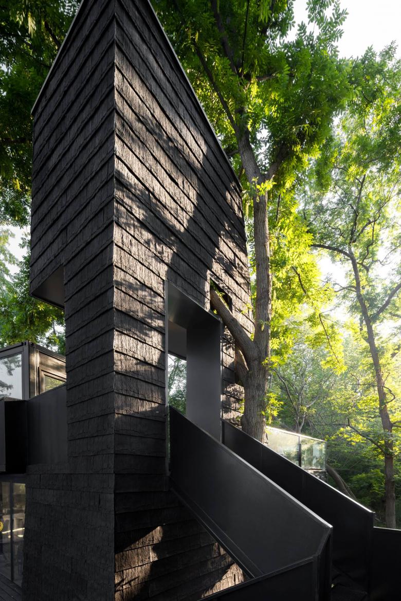 于是我们在原有集装箱的三个角落植入了三座瞭望塔,以垂直维度创造与自然对话的可能。它们将人们从平面化的日常体验中抽离,在高度变化中重新建立与自然的联系。每座塔都以独特的方式诠释着"与自然对话"的设计理念。这些垂直构筑物不仅拓展了使用功能,更创造了层次丰富的空间体验。