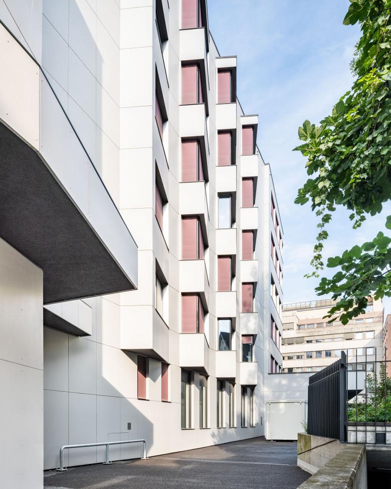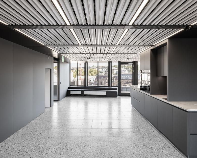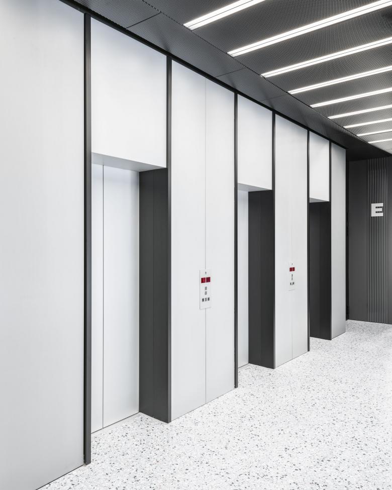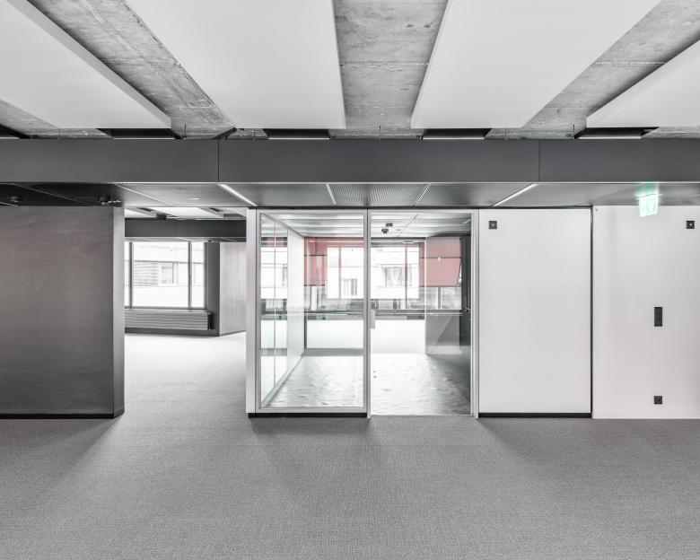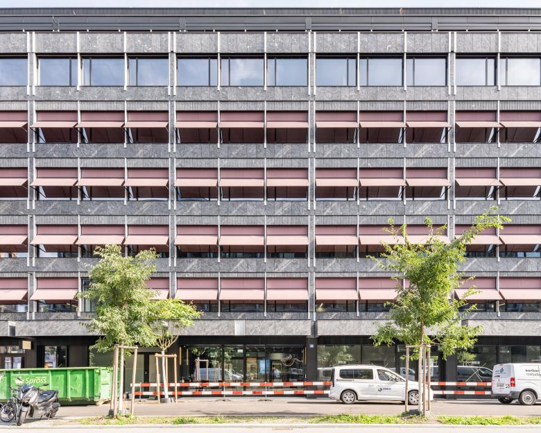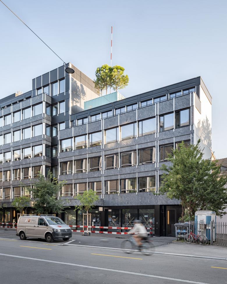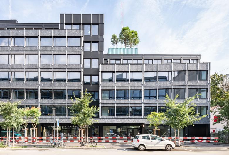 Als Rochadefläche für die Büroflächen der kantonalen Behörden vorgesehen, haben die Räumlichkeiten hohen Ansprüchen bezüglich Flexibilität der Raumaufteilung und des Gebrauchs zu erfüllen. Entsprechend weit ist die geplante Nutzungsvielfalt und eng das damit einhergehende Gebäuderaster, welches diese ermöglicht. Sowohl im Grundriss als auch an der Gliederung der Fassade wird diese zentrale Anforderung an das Gebäude ablesbar. Während die Innenräume um einen Infrastrukturkern angeordnet sind, um unterschiedliche Zonierungen entlang der Fassade zu ermöglichen, bildet diese mit Lisenen aus Aluminium die innenräumliche Gliederung als vertikales Element ab. Analog einem eleganten schwarzen Kleid hüllen sich die Brüstungen in Palissandro Nero. Dieser wird zum einen poliert, flächig eingesetzt, um ein horizontales Gleichgewicht zu den Lisenen zu kreieren, zum anderen wirkt er durch den gefrästen und profilierten Bereich spielerisch, leicht und textil.