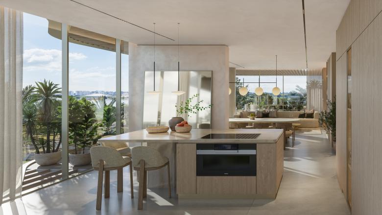 The building responds to its coastal setting through fluid form and layered articulation. Undulating balconies and soft contours echo the surrounding landscape, while overhangs and integrated greenery provide shade, depth, and environmental moderation. Full-height glazing strengthens the relationship between interior spaces and the exterior, allowing daylight and views to shape everyday experience.