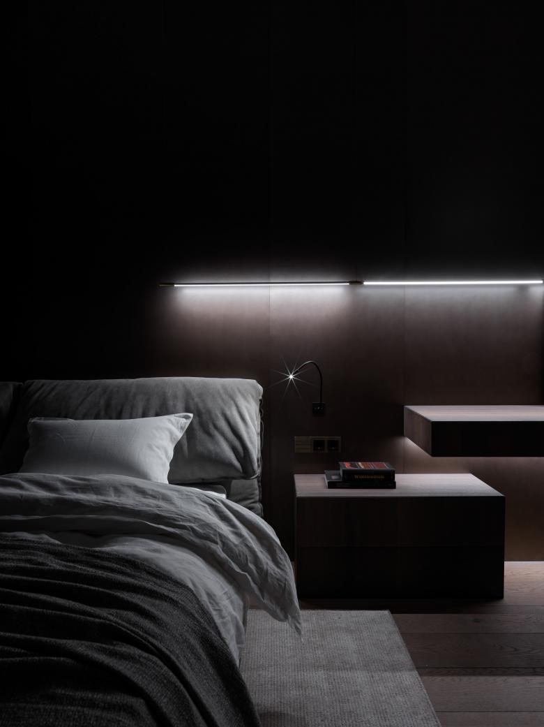The studio has paid great attention to lines, surfaces, and their harmonious interaction in the apartment. So, one of the key ideas of this interior is a brass wall that goes through several zones of the apartment. It is mounted from the hallway through the kitchen-dining room straight to the living room. The wall set the tone for the overall concept because brass accents can be noticed in all the apartments: cabinet handles, the base of light compositions, taps, and shelves.
