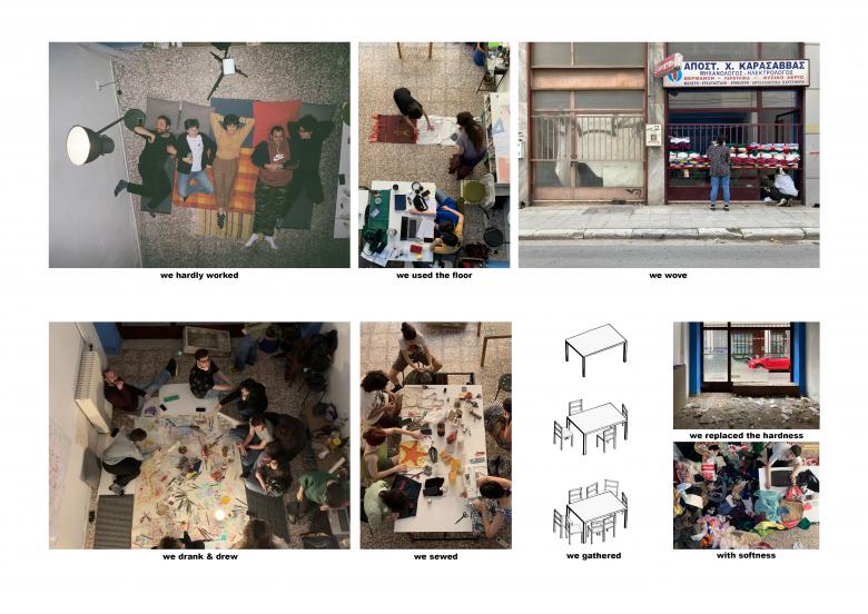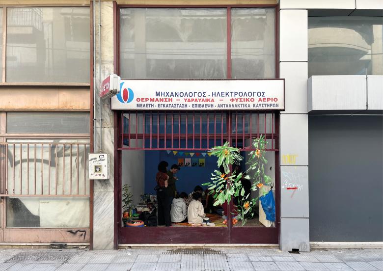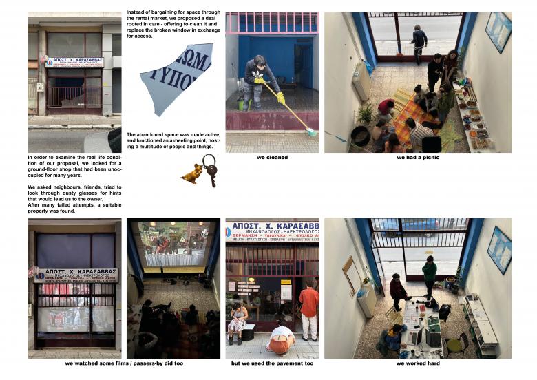 In order to experience our proposal under real-life conditions, we looked for an unused ground-floor shop. When we eventually found a property, instead of bargaining for space through the rental market, we proposed a deal rooted in care - offering to clean it and replace the broken window in exchange for access. The abandoned space hosted a multitude of people and things. It functioned first as a place for us and our friends to study and gather and later opened up to the neighbourhood, hosting workshops and talks. Our stay there coincided with the design process, as we tested our ideas and negotiated real-life challenges. The space was made a vibrant and meaningful part of our daily life.