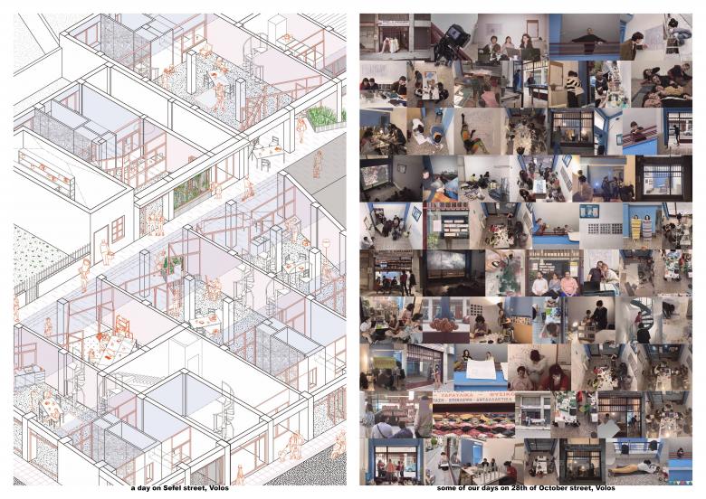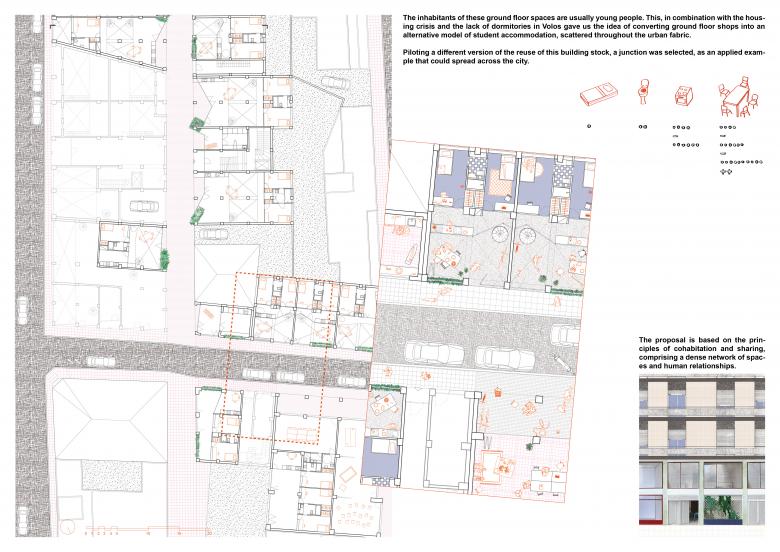 This project examines an alternative model of student accommodation, scattered throughout the urban fabric. We propose the conversion of unused ground-floor shops into student residences. Piloting a different approach to the reuse of this building stock, we try to combat the problem of lack of university dormitories in Volos, which exists alongside the broader housing crisis. A junction, including different shop typologies, was selected as an applied example that could be spread across the city.