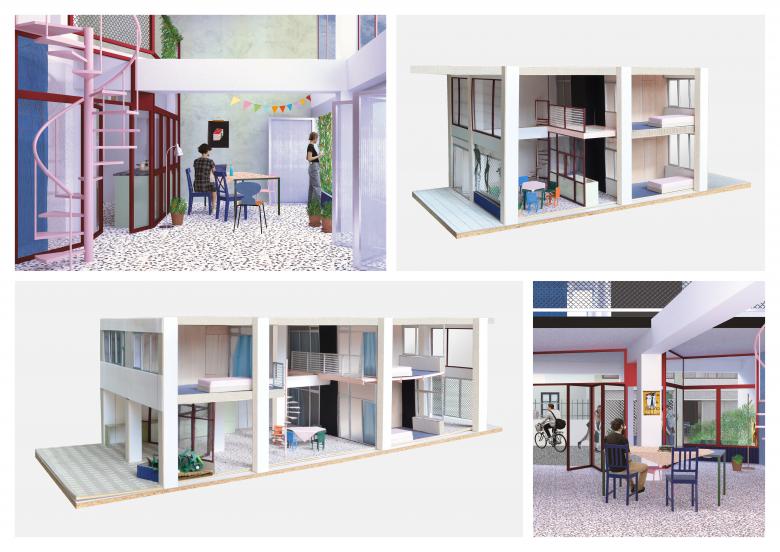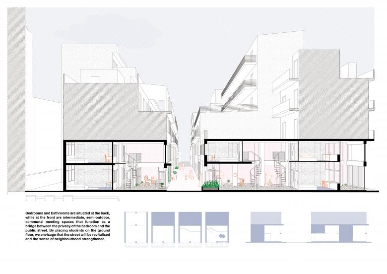 The proposal is based on the principles of cohabitation and sharing, comprising a dense network of spaces and human relationships. In terms of design, bedrooms and bathrooms create a compact core at the back, while at the front are intermediate, semi-outdoor, communal meeting spaces that function as a bridge between the privacy of the bedroom and the public street. In combination with these housing units, we propose additional communal spaces. By placing students on the ground floor, we envisage that the street will be revitalised and the sense of neighbourhood strengthened.