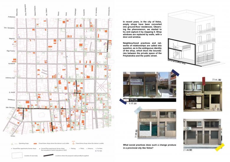 In recent years, in the city of Volos, Greece, empty ground-floor shops have been converted into residences. Shop windows are replaced by walls, with a door and window. A solid façade takes the place of the transparent previous one. Neighbourhood practices and networks of relationships are called into question, as is the ambiguous identity of the shop, which blurs the boundaries between the private space of the 'Polykatoikia' and the public street. The inhabitants of these new homes are usually students, whose housing needs are not currently met by the available university accommodation.