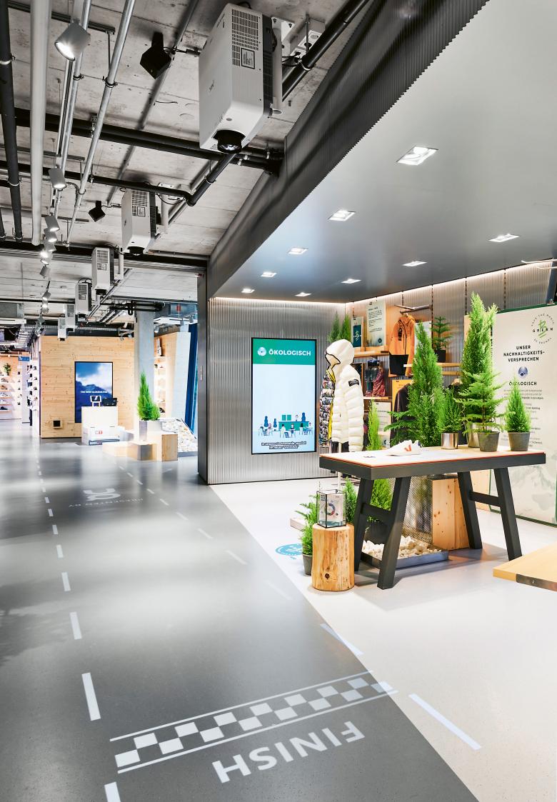 Sind die Freiflächen als Tal interpretiert, ist der Erschließungskern als Gletscherspalte ausgebildet. Höhlen, die sich auf allen vier Verkaufsgeschossen finden, fungieren als Raum in Raum und bieten Flächen für Kassen oder Pop-ups. Eine Rutsche verbindet das dritte mit dem zweiten Geschoss und macht den Store nicht allein hier zum Abenteuerplatz für Kids.